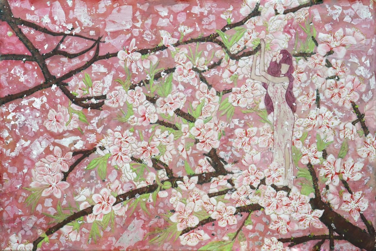 《花觅》之桃花 柯钿钿岩彩 40cmX60cm 2023年