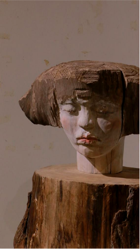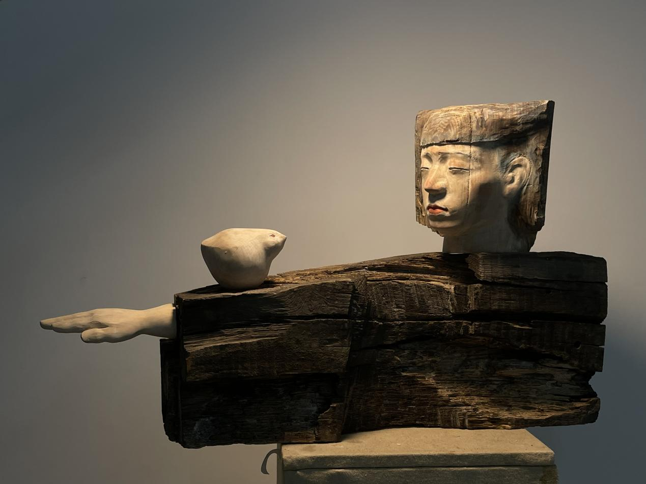 少女低眉,鸟栖于怀。木纹流淌间,刀锋凿下并非形体,人鸟相望,翎羽与衣褶在虚实中互生。刻意模糊的边界,《齐物论》的注脚:谁在凝望?谁被凝望?若蝶梦庄周,则此处木雕不过天地一瞬的残影,存留“大我”与“小我”未辨时的震颤。