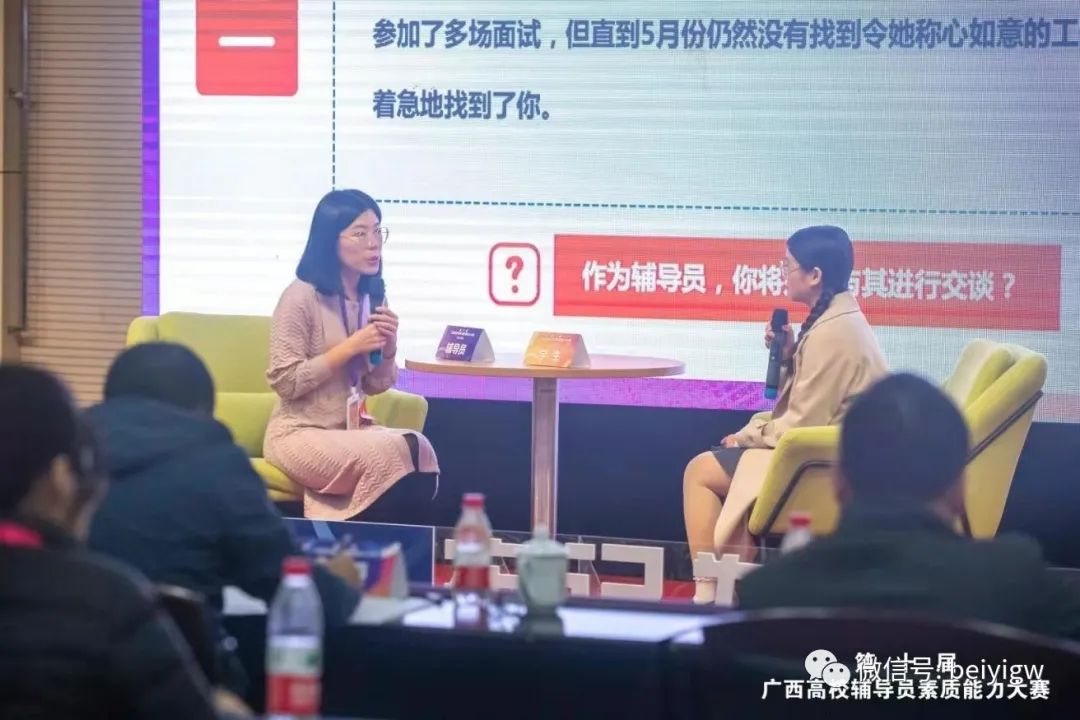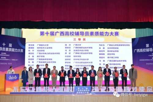 10月20-22日,广西第十届高校辅导员素质能力大赛在广西师范大学举办。本次大赛由广西壮族自治区教育厅主办,教育部高校思想政治队伍研修培训中心(广西师范大学)承办。全区81名优秀辅导员经过激烈的角逐,各优胜者在决赛现场迎来了荣耀的颁奖时刻,我校辅导员马芬老师凭借扎实的理论功底、过硬的专业技能和优秀的职业在比赛中脱颖而出,荣获广西第十届高校辅导员素质能力大赛三等奖。