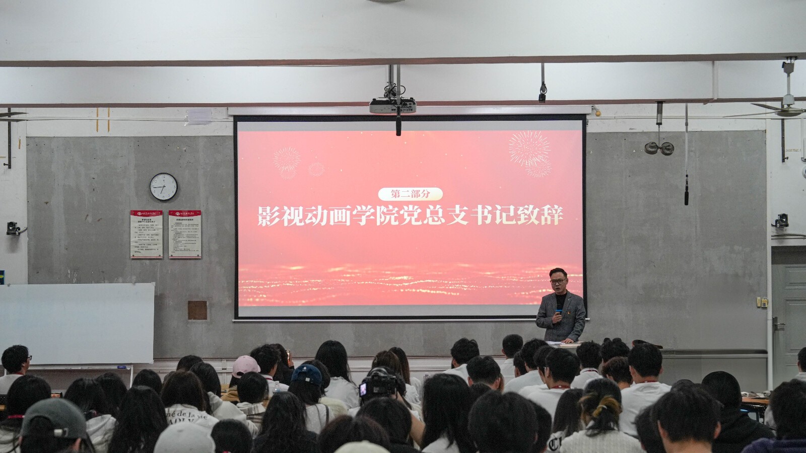 大会在庄严的国歌声中拉开序幕。学院党总支书记张帆老师致辞,充分肯定了分团委本学期在思想引领、组织建设和专业实践等方面取得的成效,并鼓励青年学子将专业创作与时代需求相结合,用动画语言传递青春正能量。