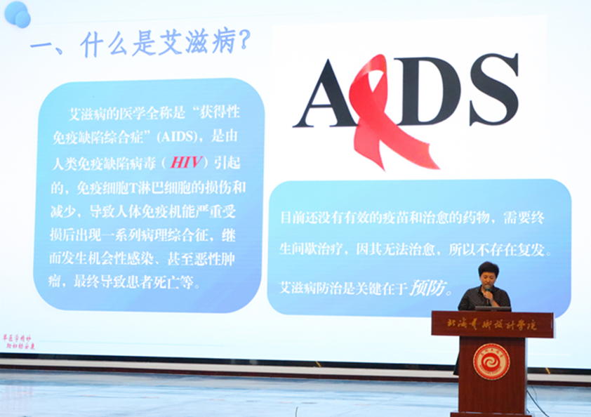 11月1日晚7:30,北海市妇幼保健院妇科副主任张莉于我校西校区大礼堂,为我校师生带来了一场主题为知“艾”防“艾”,让爱不冒险的精彩讲座。