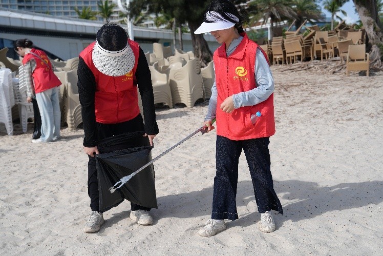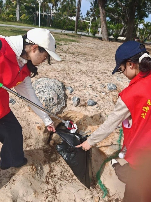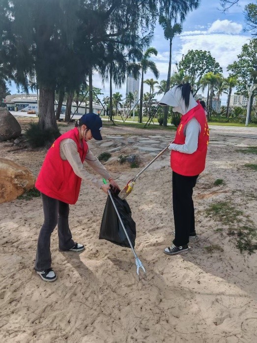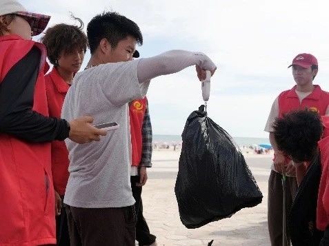 活动当天,在老师的分工下,各组领取清洁工具,为净滩行动做好充足准备。抵达银滩后,志愿者们迅速分头行动,手持工具,仔细搜寻每一处角落,将海滩上的塑料瓶、碎纸片、果皮等废弃物逐一“收入囊中”。他们互相配合,弯腰、捡拾、分类……动作重复却充满力量。烈日炎炎下,汗水浸湿了衣衫,但大家的热情丝毫不减。
