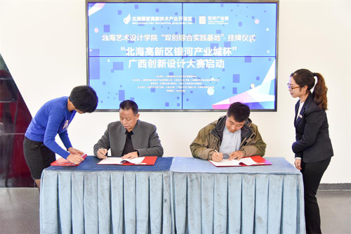 高新区签约仪式完成后,接下来揭幕牌匾并宣布“北海高新区银河产业城杯广西创新设计大赛”正式启动。
