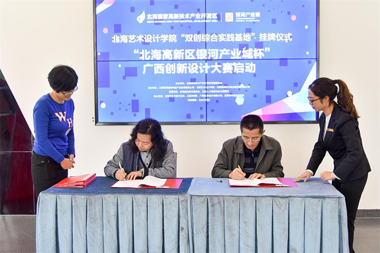 令人激动隆重签约仪式正式开始。首先是北海高新区和我院代表签约。紧接着是银河产业城和我院环境艺术学院代表签约。