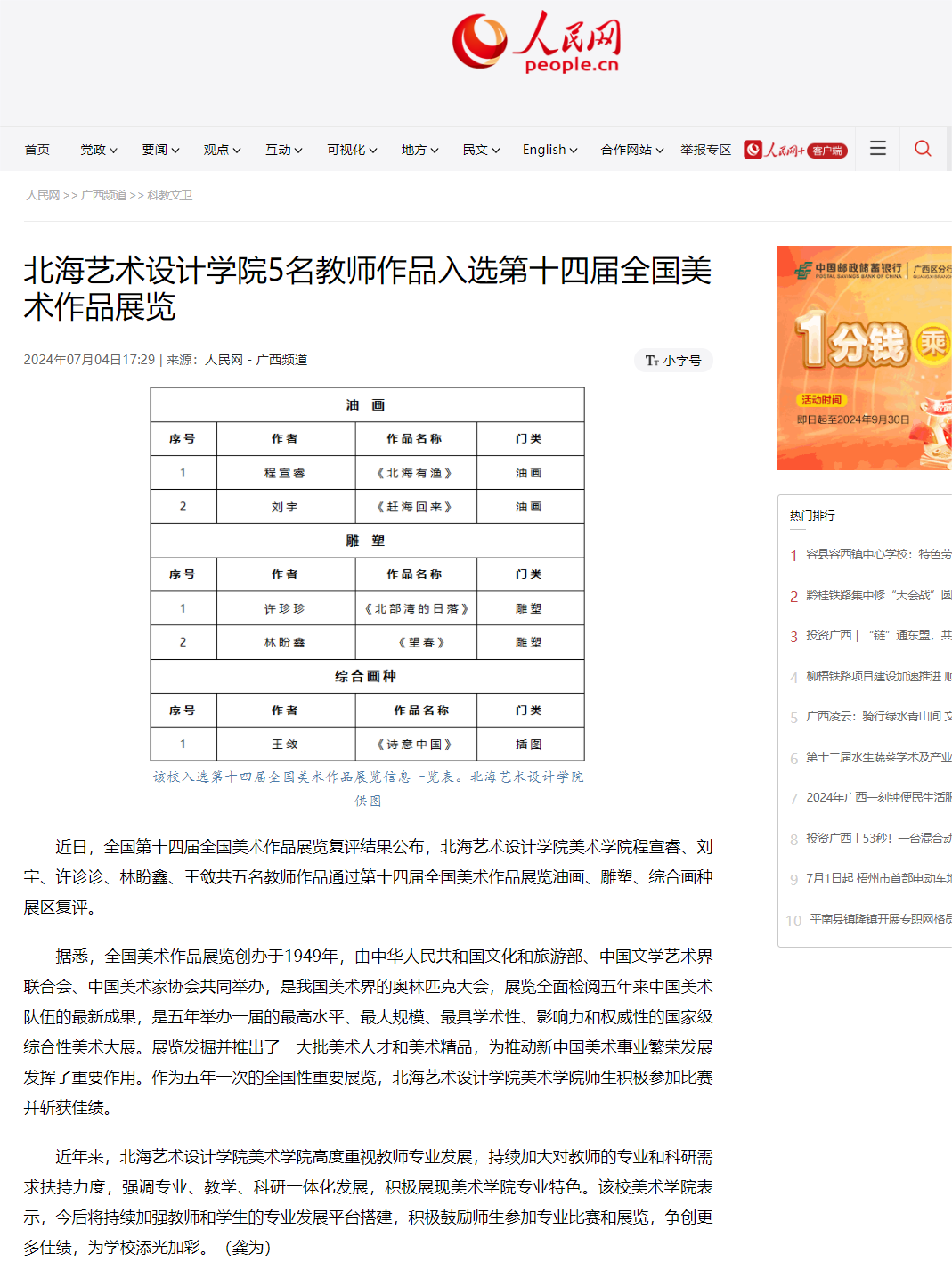 人民网:北海艺术设计学院5名教师作品入选第十四届全国美术作品展览
