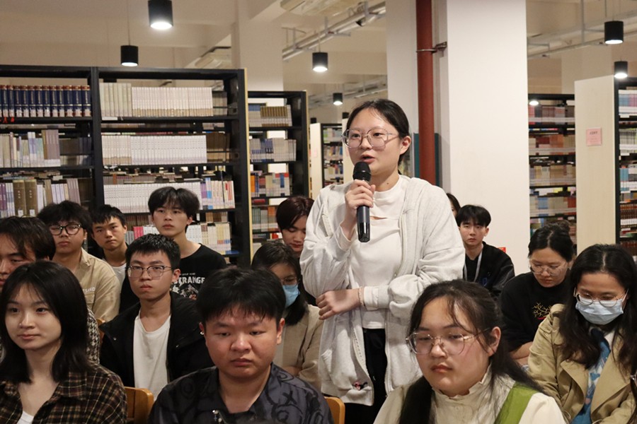 分享会上,学校图书馆馆长王作先对《复兴文库》进行了简单介绍,该书的编纂出版是党中央的一项重大文化工程,述录先人的开拓,启迪来者的奋斗,整套丛书值得广大师生认真学习研究。紧接着,马克思主义学院院长姜献生、副院长罗秋梅、综合办副主任王佳碧作为分享嘉宾,从不同角度沉浸式分享了此套丛书中“八七会议”的记录节选,对其召开历史背景、参加人员、会议目的、主要意义等方面内容进行拓展分享。在采取近距离一问一答形式的互动环节,现场师生对“共产国际为什么要求共产党员以个人身份加入国民党?八七会议参会人员为何如此少?八七会议为什么能顺利召开?”等问题与分享嘉宾现场结合《复兴文库》一一进行解答探讨,充分展现了对此套藏书历史价值、文化价值的极大热情。