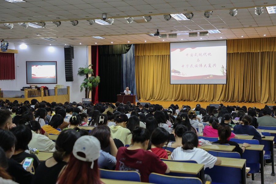 课上,马克思主义学院院长姜献生教授、韦邕青老师分别从中华民族伟大复兴的中国梦、中国式现代化发展之路、以中国式现代化推动中华民族伟大复兴、中国式现代化进程中的青年选择四个方面生动诠释了中国式现代化与中华民族伟大复兴的深刻意蕴和时代意义。据了解,此次上课教室里“人满为患”,甚至还有学生直接搬着凳子旁听, 深受在场师生的喜欢和热爱。