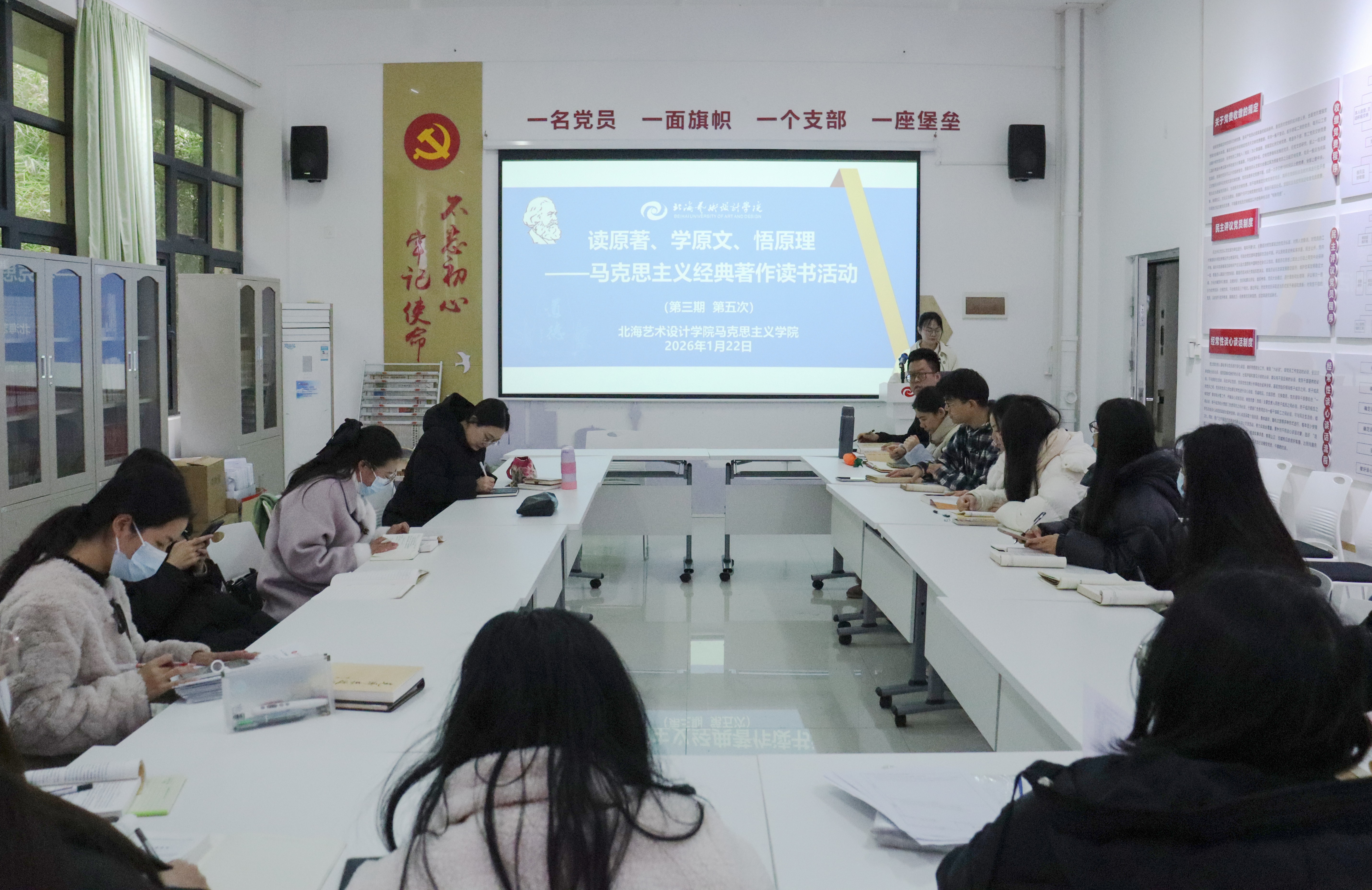 1月22日,马克思主义学院在西校区行政楼103红色驿站举行第三期马克思主义经典著作读书第五次活动。活动由马克思主义学院副院长张宇飞主持,马克思主义学院思想道德与法治教研室主任曾婷主讲《反对自由主义》,马克思主义学院全体中青年教师参加活动。