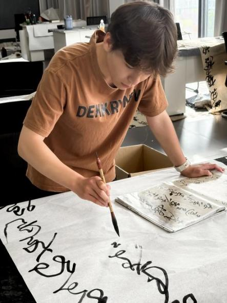 在长达七年的书法研习之路上,邓钧禧不断突破自我,实现艺术创作的蜕变。跳出惯性书写的“舒适圈”,不再机械临摹、重复技法。通过持续钻研与探索,完成了从单纯“抄字”到“悟道”的跨越。在他看来,书法不仅是技法的锤炼,更是一场终身修行。凭借对艺术本真的执着追求,邓钧禧在传承传统笔墨韵味的同时,融入当下审美,让书法作品既有古典意趣,又具时代气息。(盛可欣 贺梦真 摄)