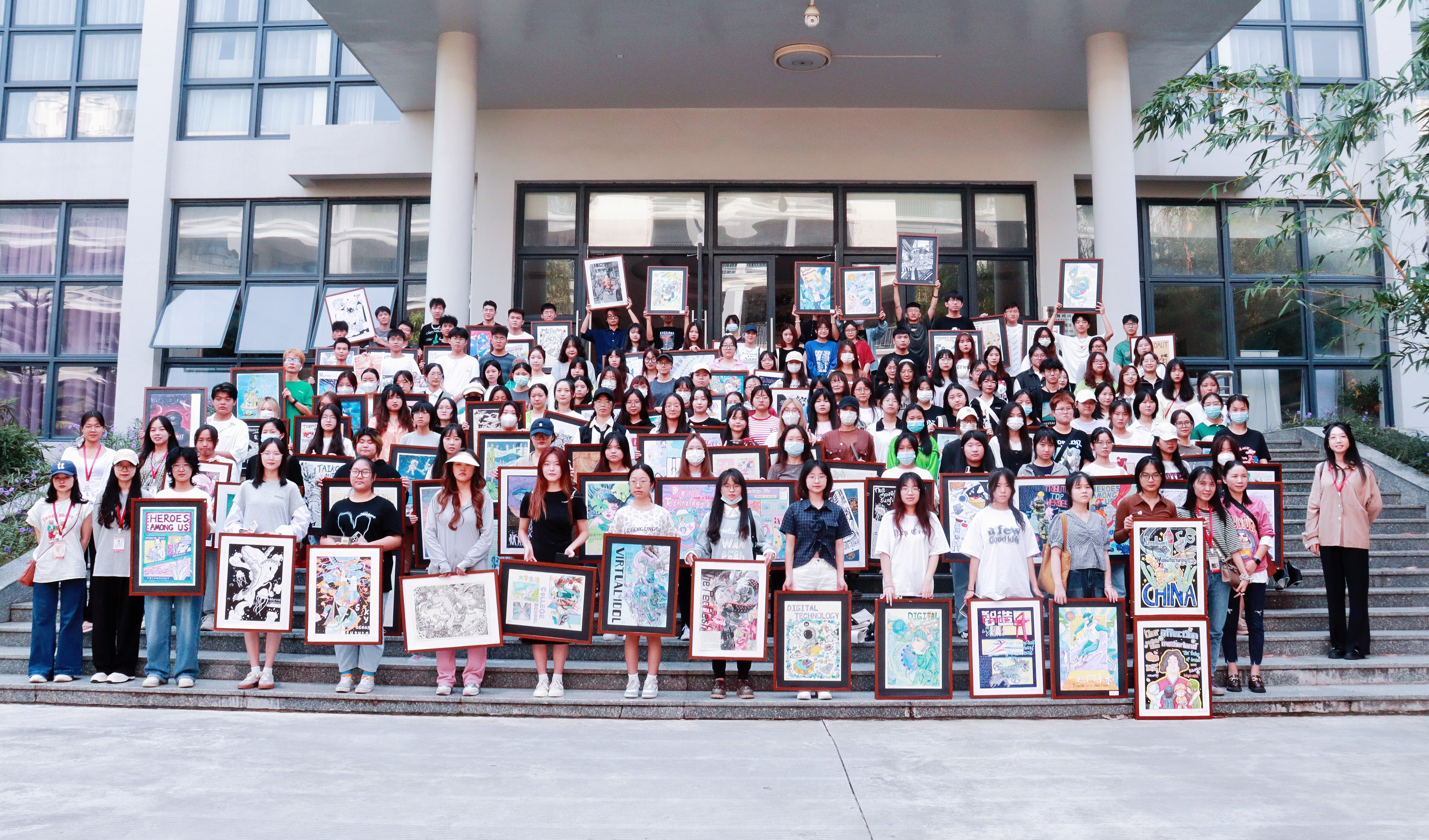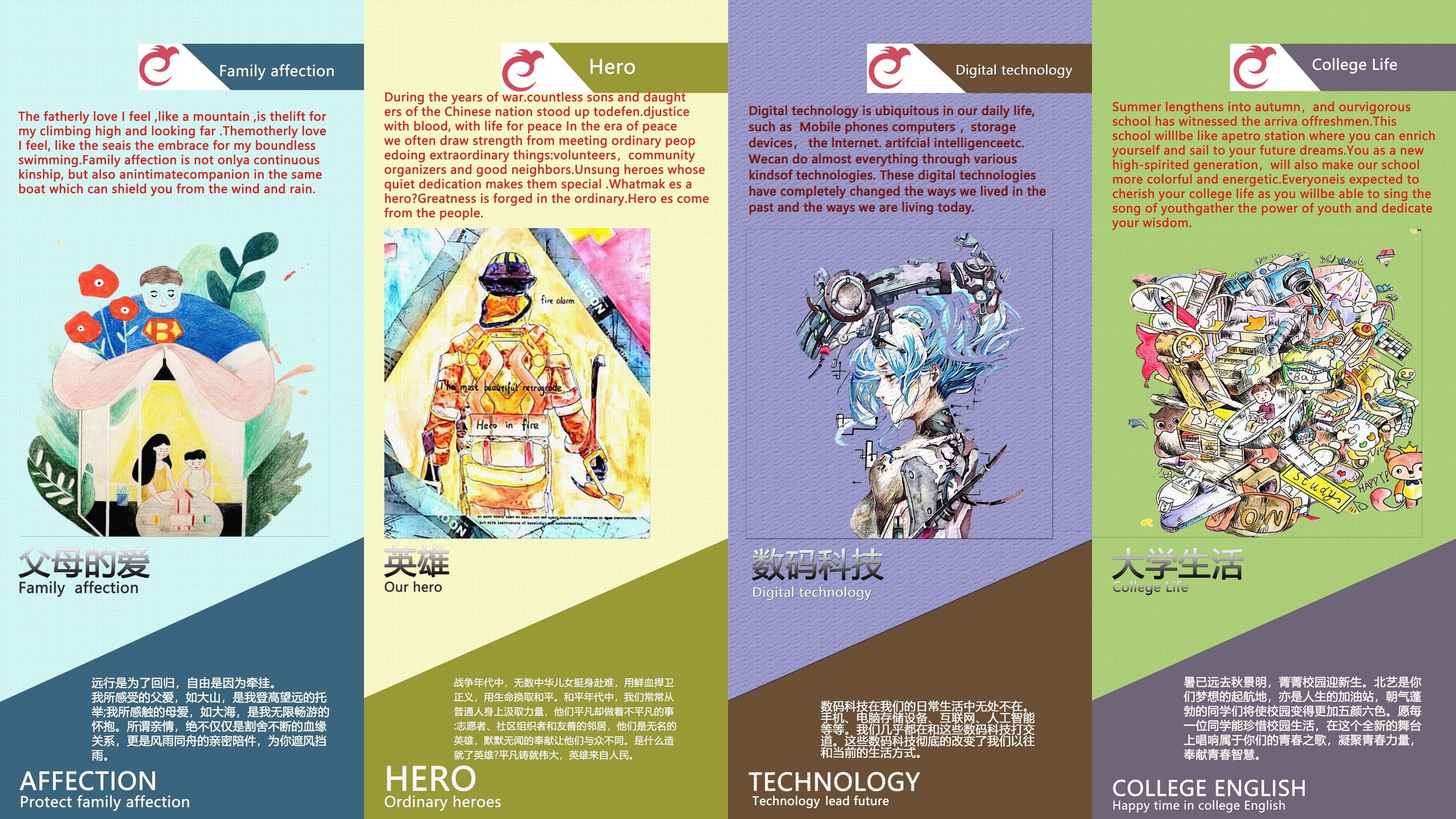 是艺术设计类院校,在英语课堂教学中,我们以课本为依托,以中国传统文化和时政热点为主题,以学生个性化设计为载体,将英语应用于设计过程。所有展览相关的设计都由学生投稿选拔而出。今年共选出1张主海报、8张主题海报、7张宣传海报以及相关作周边设计。