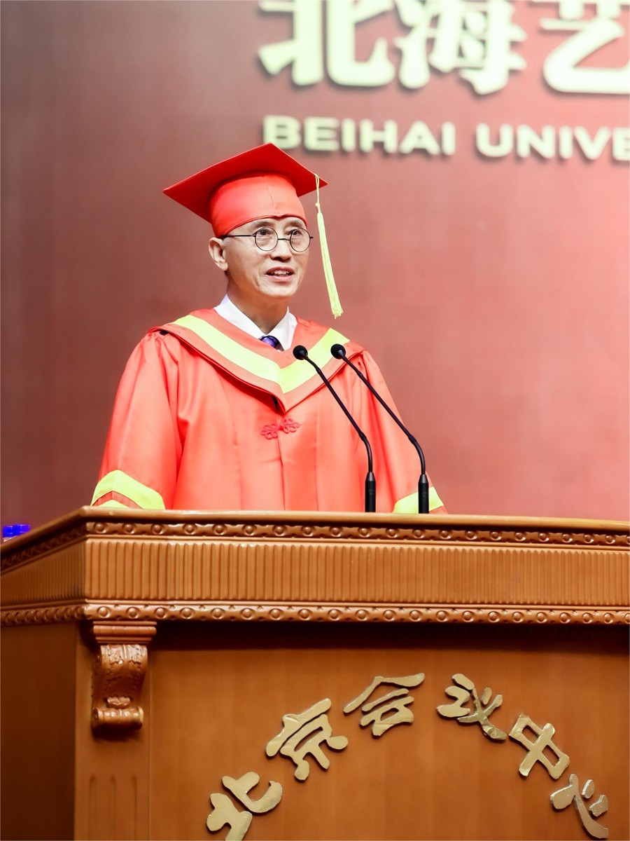 校长卢新华以《做德艺双馨的时代新人》为题,为即将告别校园,开启人生新篇章的2024届毕业生致以最真挚的祝福和寄托。他指出,广大毕业生在学校“北海北京双城育人,名校名师双名引领”下不断成长,在“道德为本、艺术求精”的办学理念洗礼下,启迪思想灵魂,升华人格境界,成为德智体美劳全面发展,充满创新活力的青年才俊,在北艺校园留下了精彩的青春故事、奋发向上的励志事迹和勤奋向上的足迹。在毕业生们即将离开母校,扬起人生理想风帆,走向新生活,开创新事业,开启新旅程之际,卢新华对2024届毕业生提出三点希望:一是要心无旁骛,勇于担当,不负时代赋予的使命。在这个伟大的变革时代,机遇和挑战并存,要保持兢兢业业、一丝不苟的做事态度和精益求精、尽善尽美的精神追求,要立鸿鹄伟志、守报国丹心,将青春梦想融入中华民族复兴的伟大梦想,奋发图强,争做社会主义核心价值观的坚定信仰者、积极传播者、模范践行者,早日成为国家的栋梁之才,报效祖国,不负韶华,不负时代使命;二是要立德修身,砥砺品格,做德艺双馨的优秀人才。立德修身是一生的修为,同学们要牢记北艺校训“道德”二字,明道立德,做道德修养深厚、情操境界高远的人,不断超越自己,明大德,立大志,以德铸魂,磨砻淬砺,坚定共产主义理想信念,全心全意为人民服务,应时代之需励志逐梦,早日成为德艺双馨的优秀人才;三是要业精于勤,敢闯会创,做勇于创新的带头人。大家要敢闯会创,敢为人先,敢于尝试,敢于探索,有业精于勤的专业修炼,深厚的人文修养和理论基础,有超强的实践能力和开阔的视野,提高创新思维的综合素质,因势利导,抓住机遇,发挥优势,闯出事业的新天地,在人生的征程上勇毅前行,坚定信心,勇立时代潮头,争做时代先锋,打造无怨无悔的精彩人生。卢新华寄语广大毕业生勇敢展翅高飞,乘风破浪,在各自所选择的事业上做出无愧于人民、无愧于祖国的杰出成就。他还表示,母校北艺将永远是毕业生们坚强的后盾、温暖的港湾,希望大家梦想成真,事业有成,捷报频传。