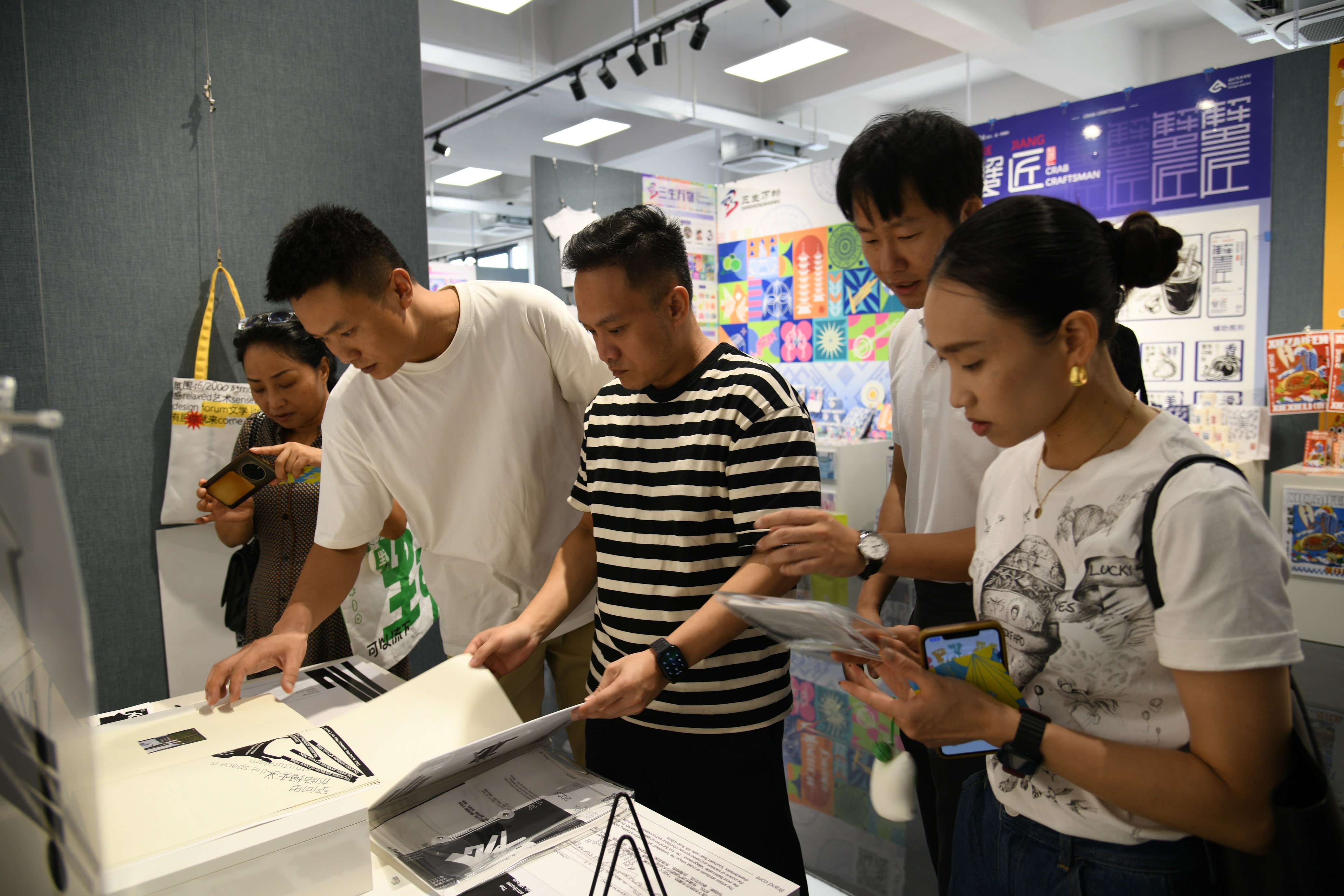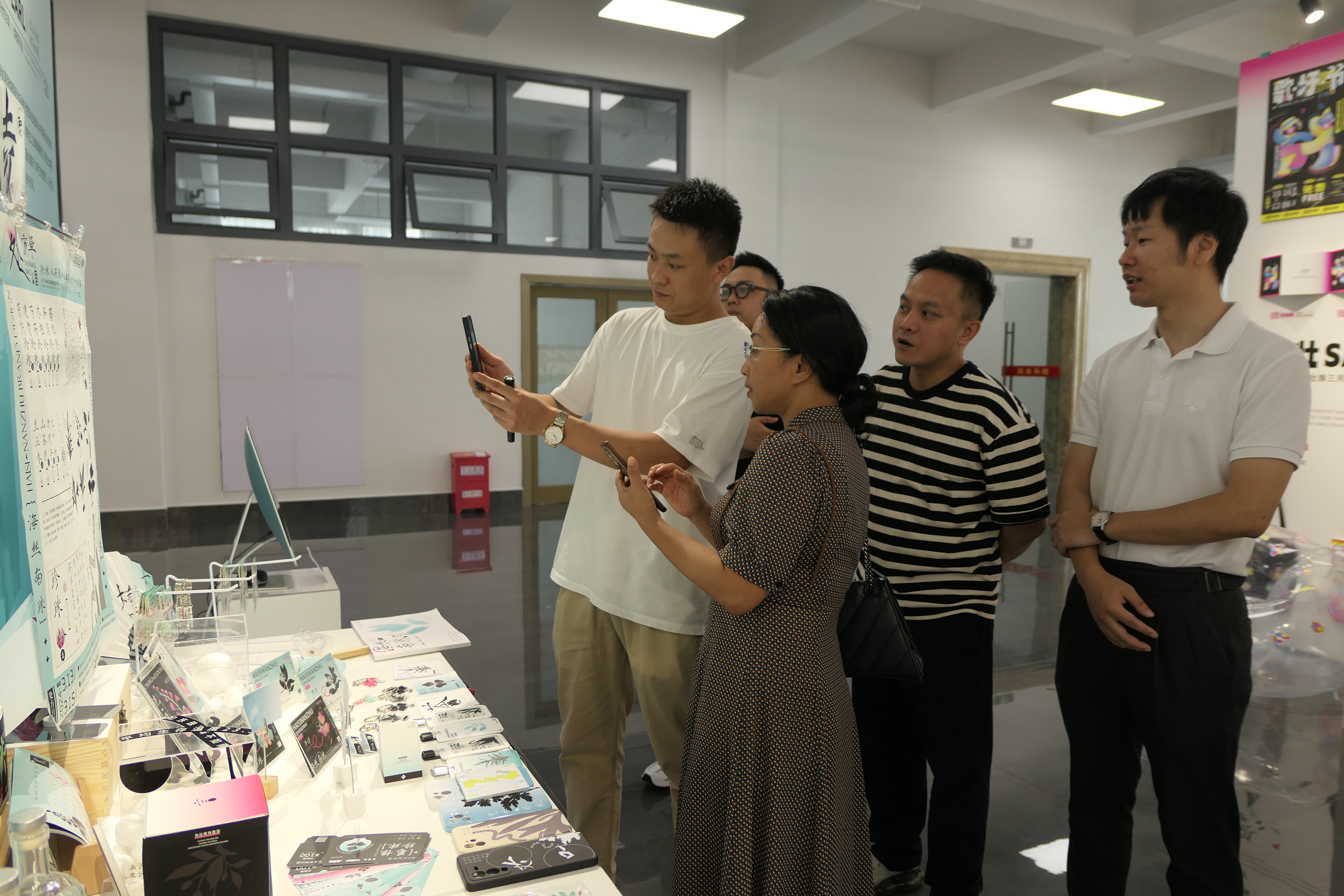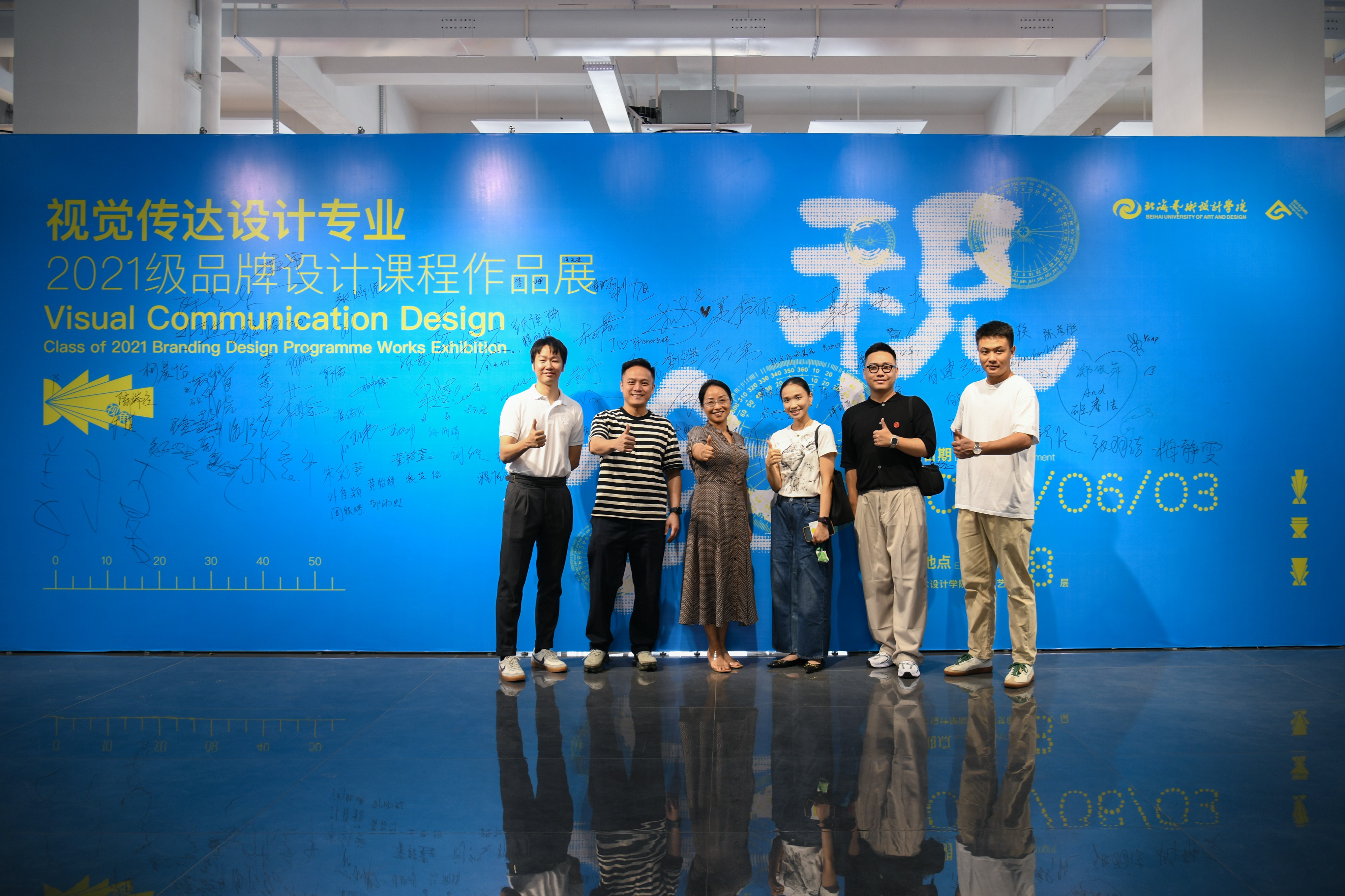 陈丹玲书记(左三)、伍岳总经理(左二)、徐雅斯总监(右三)与实验室副主任岳沛龙(左一)、宋超(右二)、教研室副主任石宏伟(右一)在 2020级品牌设计课程作品展主视觉展板前签字留影