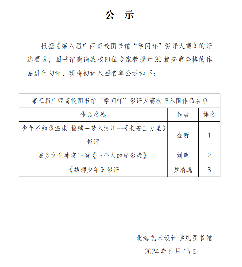 第六届广西高校图书馆“学问杯”影评大赛初评入围名单公示