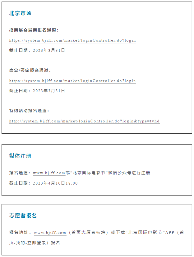 第十三届北京国际电影节将于4月22日-4月29日在北京举办!组织“天坛奖”评奖、开幕式、北京展映、北京策划·主题论坛、北京市场、电影嘉年华、大学生电影节、闭幕式暨颁奖典礼、“电影+”九大主体板块及相应活动。北京国际电影节组委会在此诚挚欢迎海内外影人、影业机构、剧组以及媒体记者朋友们来到北京,在这个春天与我们相聚、与电影相约!