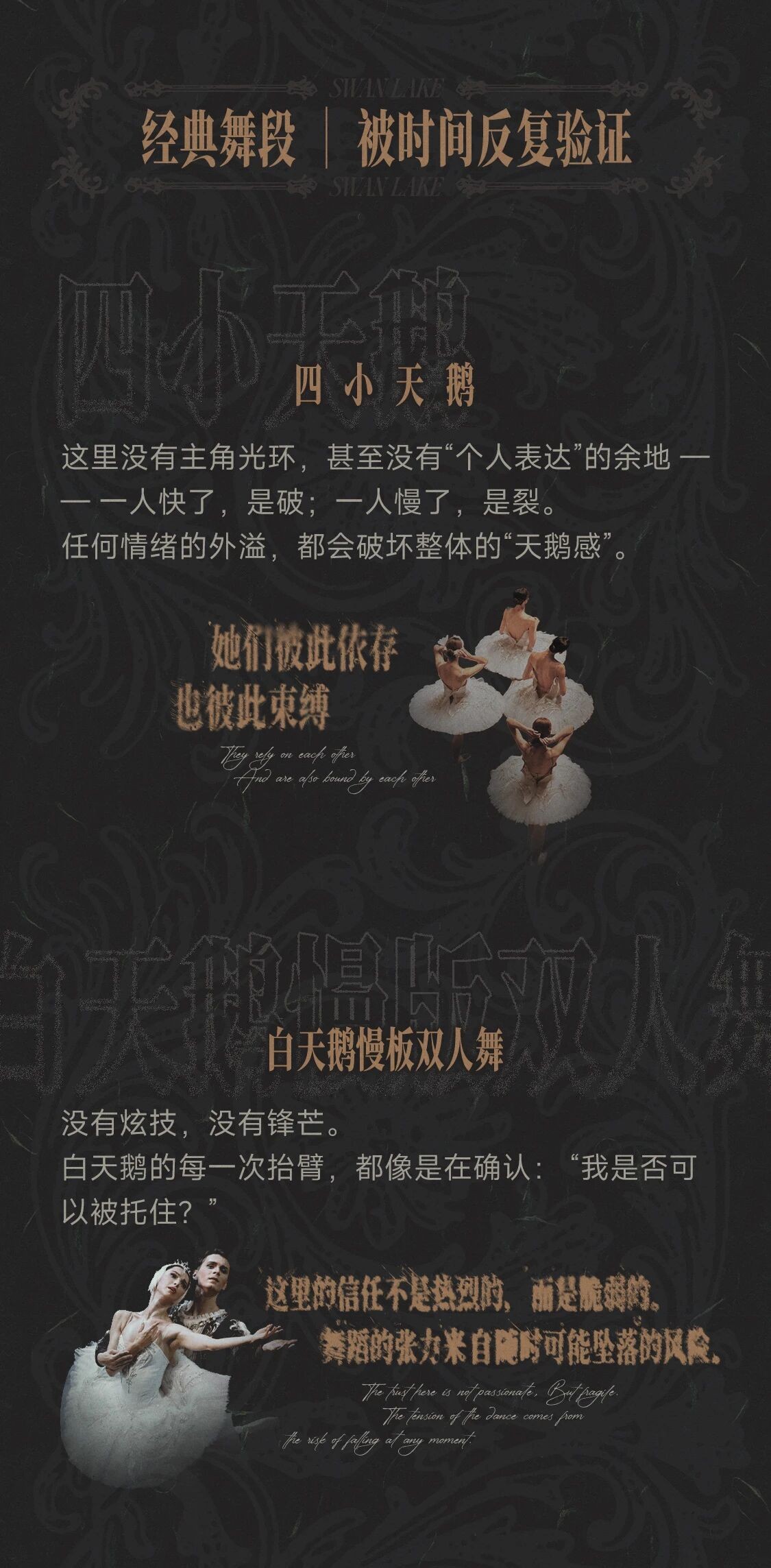 《天鹅湖》堪称世界芭蕾艺术殿堂中臻于完美的传世典范。作品围绕“光明与黑暗”的永恒命题,讲述了被邪恶魔咒禁锢、幻化为天鹅的少女的传奇故事。这个古老传说曾深深触动柴可夫斯基的灵魂,其恢弘乐章更引领无数编舞大师塑造了芭蕾史上不朽的艺术形象。