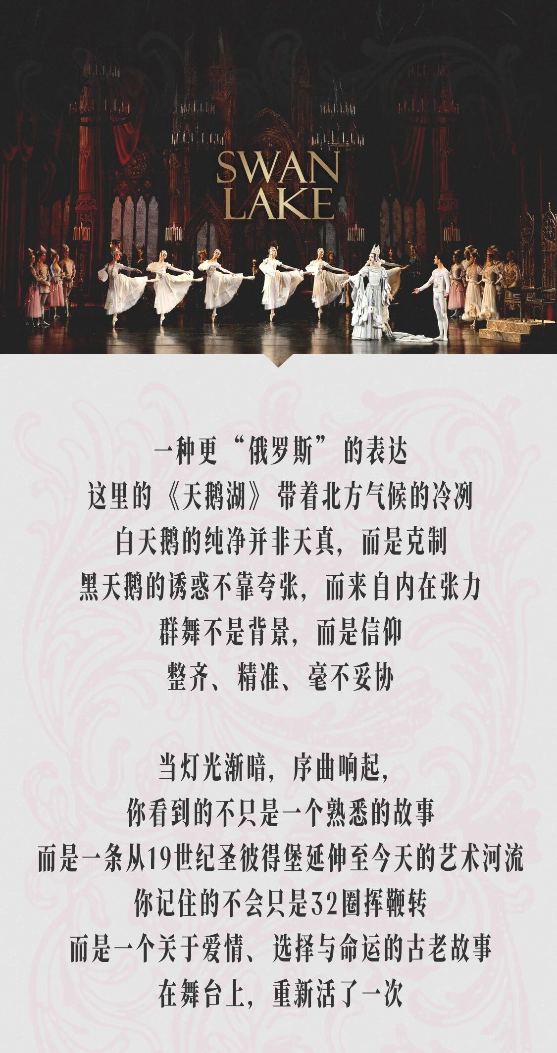 圣彼得堡国立模范芭蕾舞团的《天鹅湖》,既忠于俄罗斯学派的技术根基,更强调身体的表达力、戏剧张力,以及舞蹈与音乐之间的高度契合——让观众不仅“看到动作”,更“理解命运”。