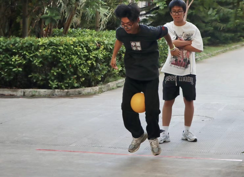 关卡三:快乐爆气球接力赛,同学们自由组合为两个俩人小组,比赛开始后第一组成员合力吹打6个气球,由第二组成员负责依次在地上坐爆,直至两组全部完成,视为过关。在惧怕气球爆炸声的情况下,同学们还是表现了他们闪闪发光的一面。