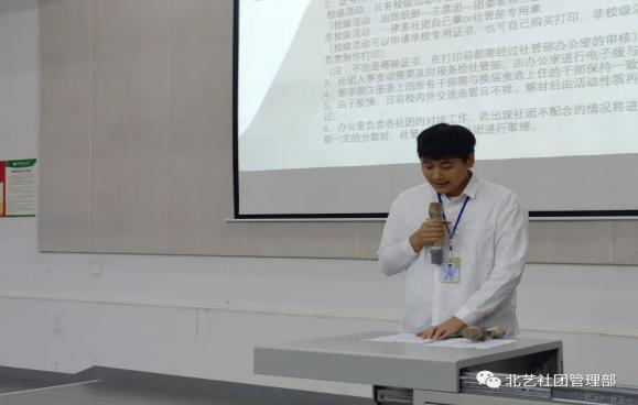 主席团代表魏天意讲了社团的日常工作,社团开课考勤和社团卫生检查的要求。