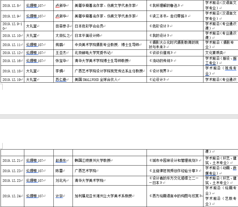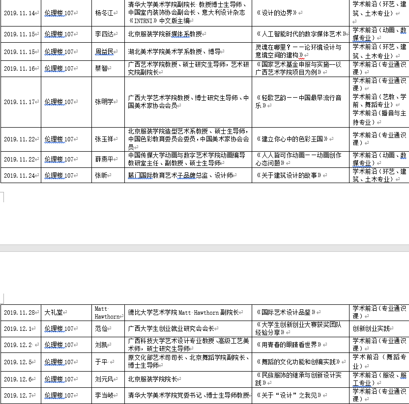 2019年下半年北艺名师大讲堂信息统计