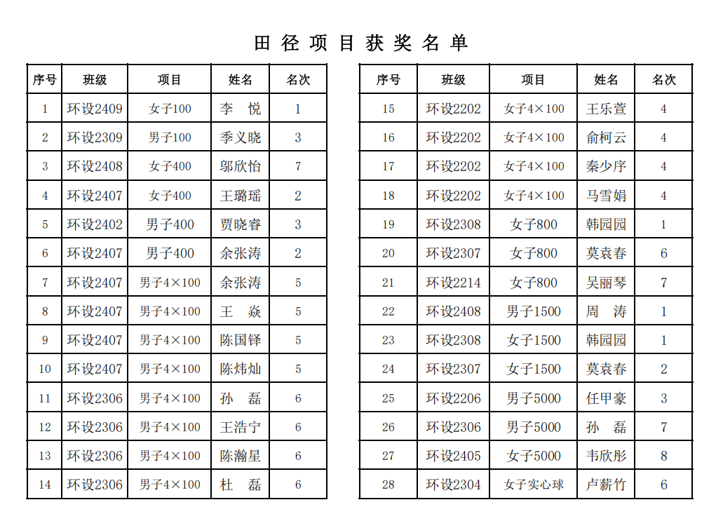 建环学院田径项目获奖榜