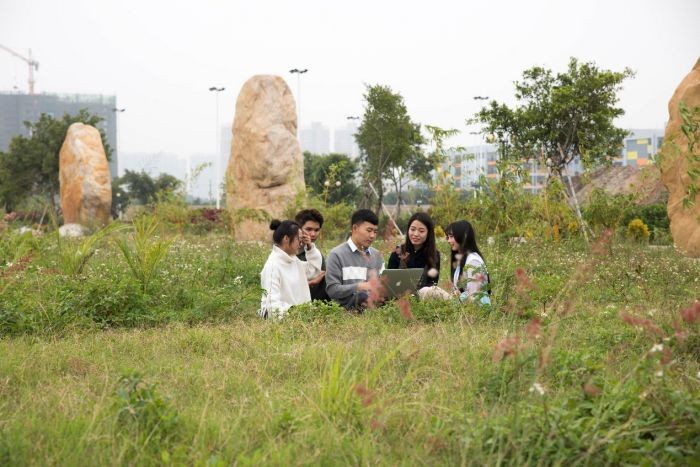 这是公德楼楼下的拍摄场地,阳光不燥,微风正好。两位正在交流问题的同学款款走来