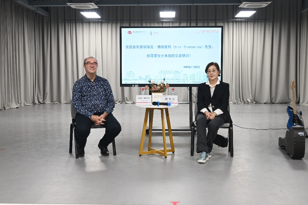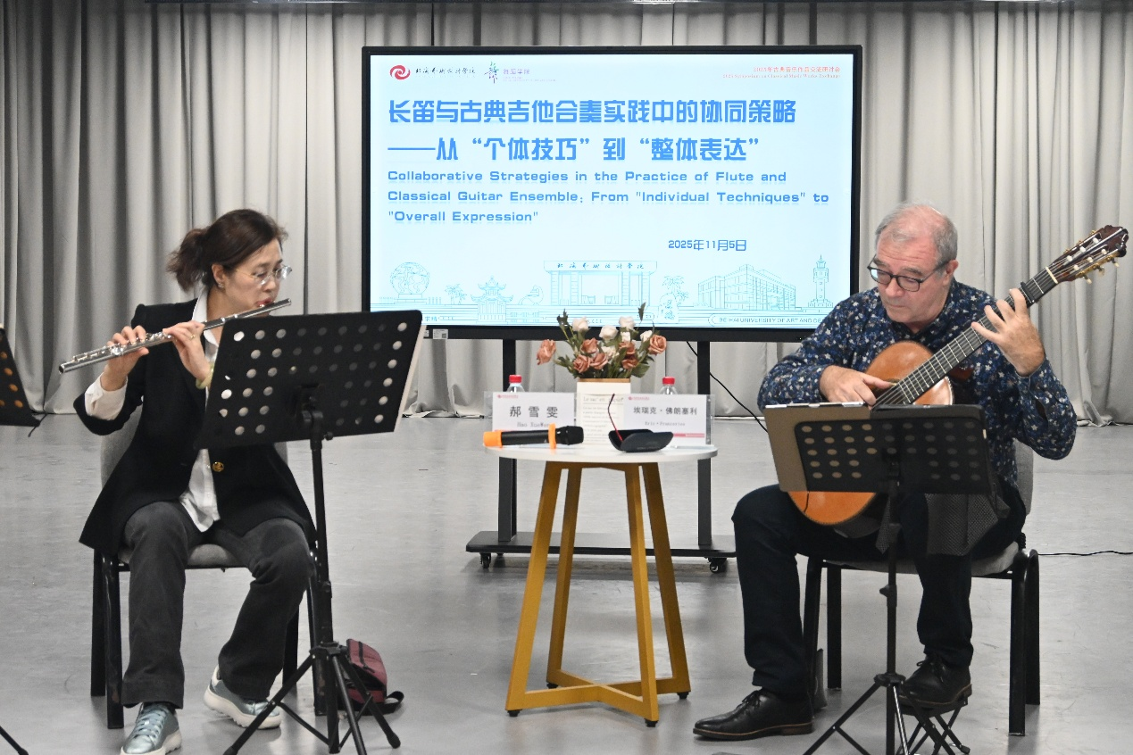 2025年11月5日,法国著名古典吉他演奏家埃瑞克·佛朗塞利与旅法长笛演奏家郝雪雯女士莅临北海艺术设计学院,以“长笛与吉他合奏实践中的协同策略——从个体技巧到整体表达”为主题,为师生带来了一场兼具专业深度与艺术魅力的交流研讨。