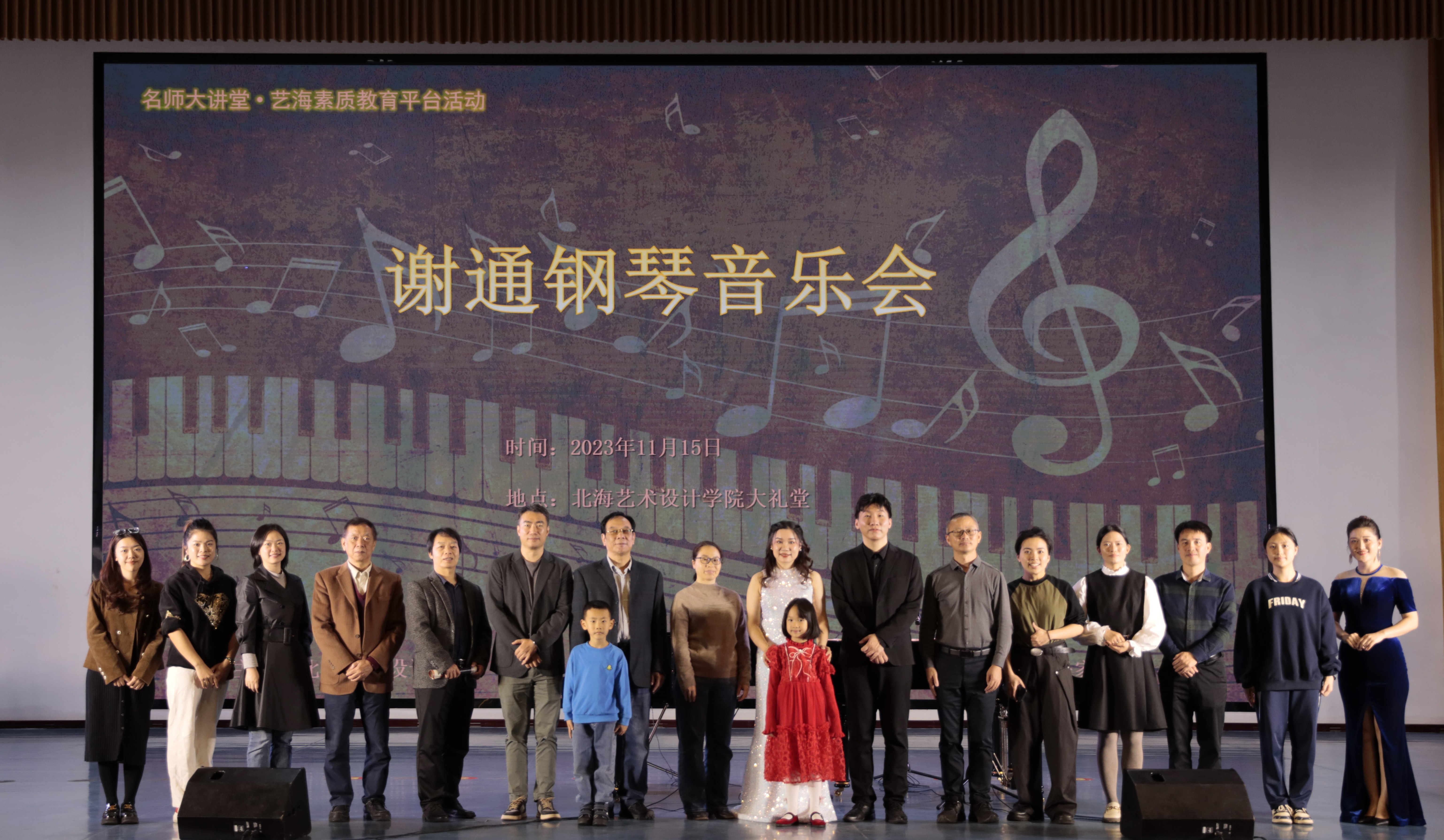 11月15日晚,谢通博士应邀在我校西校区大礼堂举办个人钢琴独奏音乐会。当晚,北海艺术设计学院总督学王斌、人文教育学院院长熊秀峰、副院长李谦等领导与北海音乐家协会、社会各界领导嘉宾同我校师生一起观看了演出。本次音乐会由人文教育学院艺术教育教研室曲忠坤老师主持。