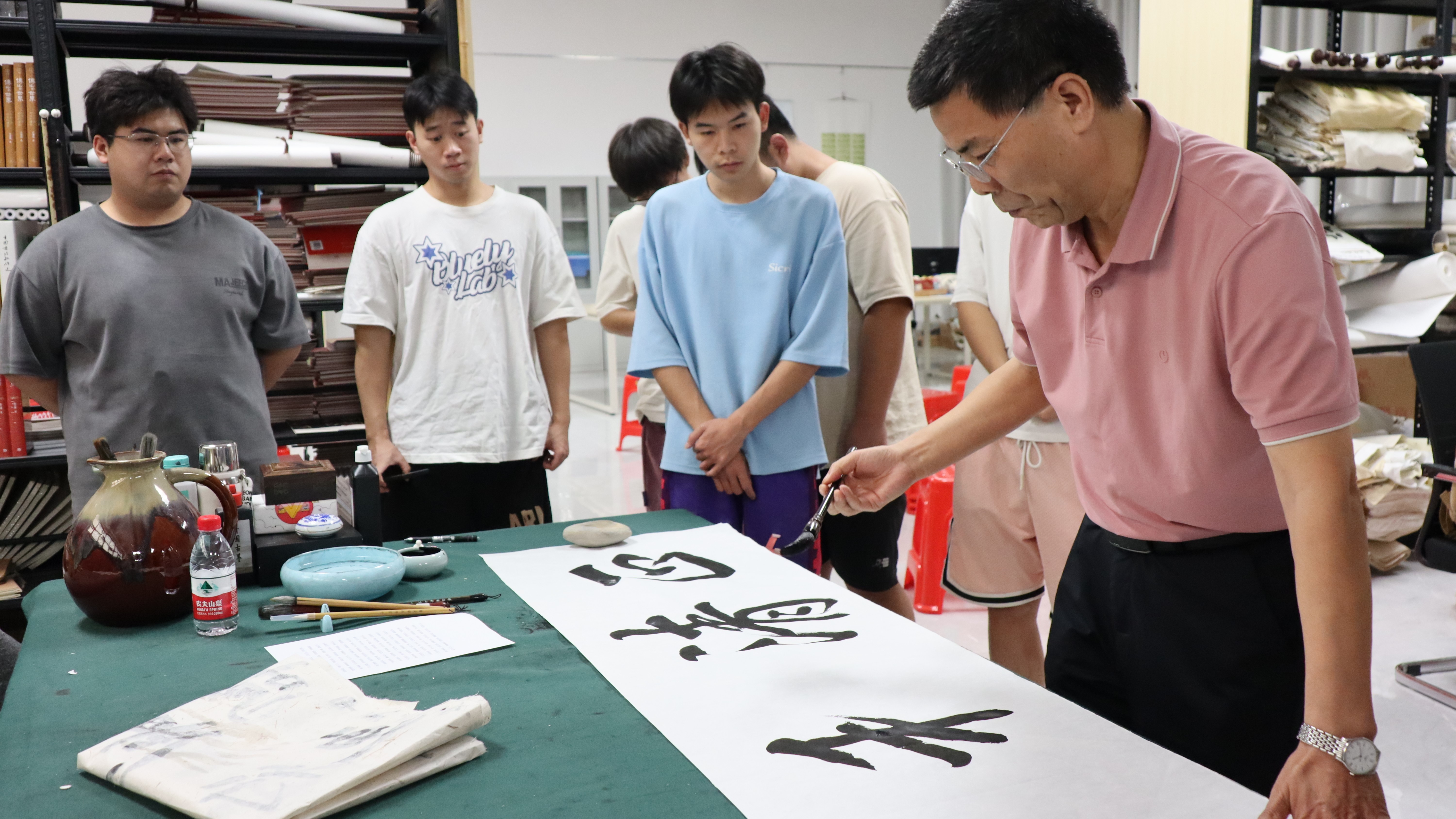 随着座谈会的圆满结束,交流笔会正式开始。在轻松愉快的氛围中,书法家们纷纷拿起毛笔,在宣纸上挥洒自如,展示自己的书法技艺。李和生副主席也亲自上阵,与大家一同挥毫泼墨,交流切磋。在笔会过程中,书法家们不仅展示了自己精湛的书法技艺,还耐心地指导在场的同学们,传授了许多宝贵的书法创作经验。书法家们的示范和指导,让同学们深受启发,纷纷书法家们积极交流学习。