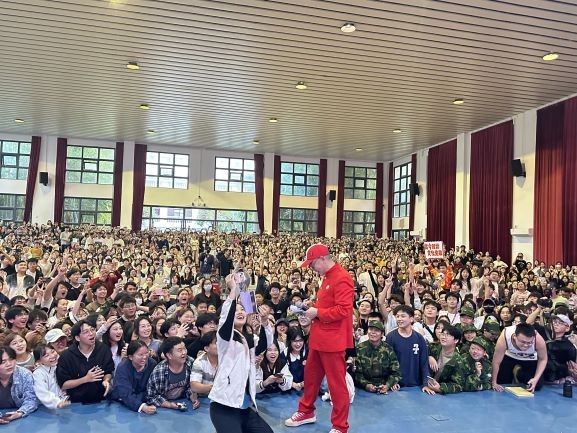 为了满足同学们的合影要求,章老师走到舞台前,蹲下身子,与现场全体同学一起合影。随着潮水般汹涌的欢呼声,摄影师将章老师亲切和蔼的笑容,与同学们脸上洋溢的喜悦与激动,定格成了永恒的瞬间。合影结束后,章老师站起身来,向同学们挥手致意,感谢他们的支持。同学们以雷鸣般的掌声和欢呼声向章老师致以最崇高的敬意和感谢。