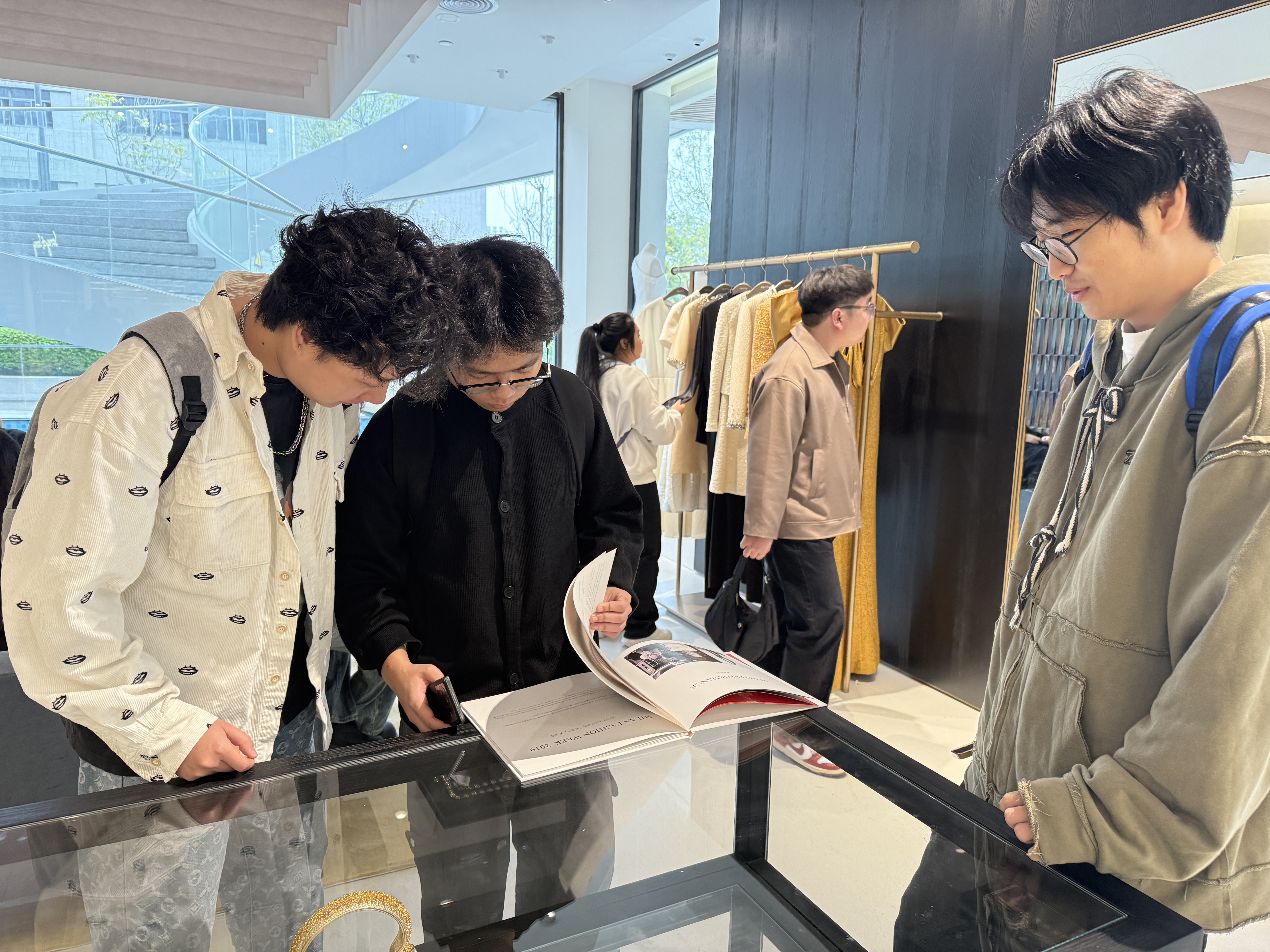 最后一站,服装学院调研师生走进例外品牌公司。作为中国原创设计的标杆,例外将手工刺绣、植物染色等非遗技艺与现代科技结合,打造兼具东方美学与国际审美的服装。其陈列空间以书籍、古董柜等元素烘托文化氛围,颠覆传统卖场逻辑,令学生深刻感受到品牌对文化传承与创新的执着。