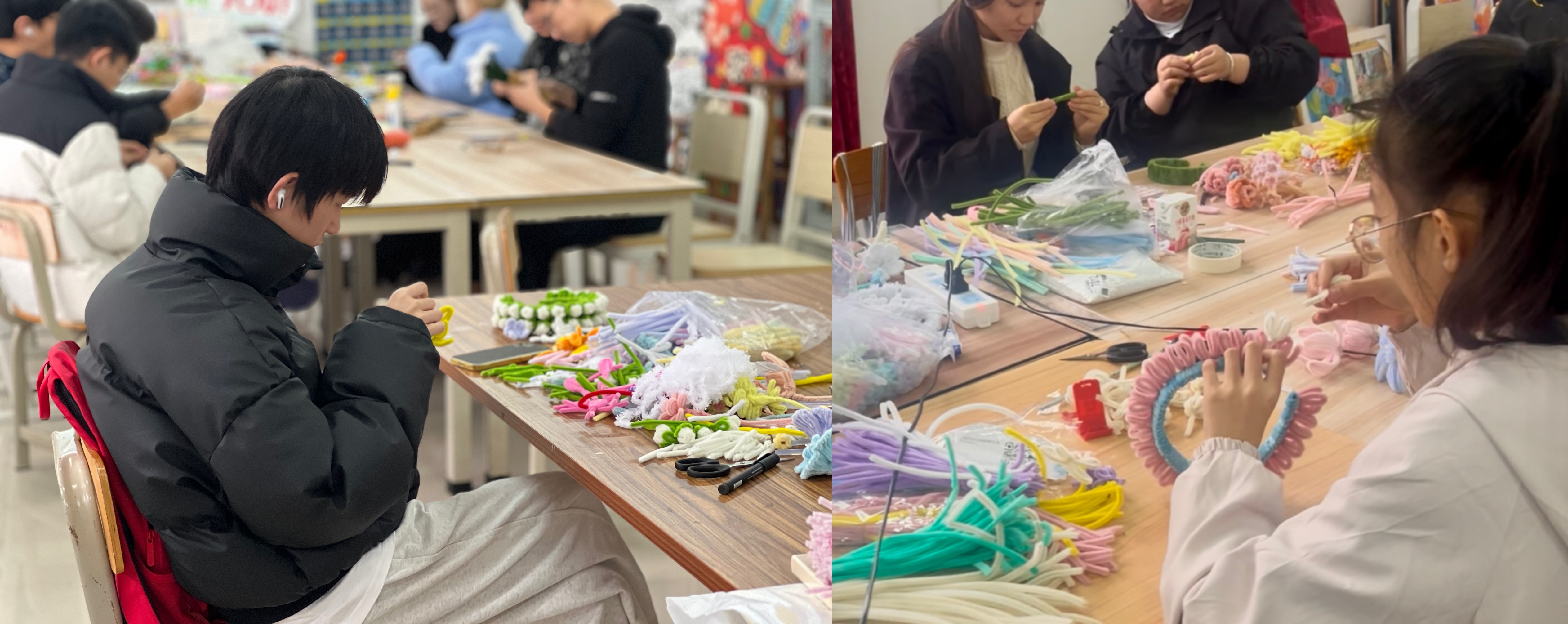扭扭棒材料的引入旨在保留簪花传统文化的同时,打破传统簪花制作对鲜花材料和技艺要求较高的局限,学生用扭扭棒对簪花的色彩造型进行创新设计,融入现代时尚元素,让古老的簪花焕发出时尚活力。