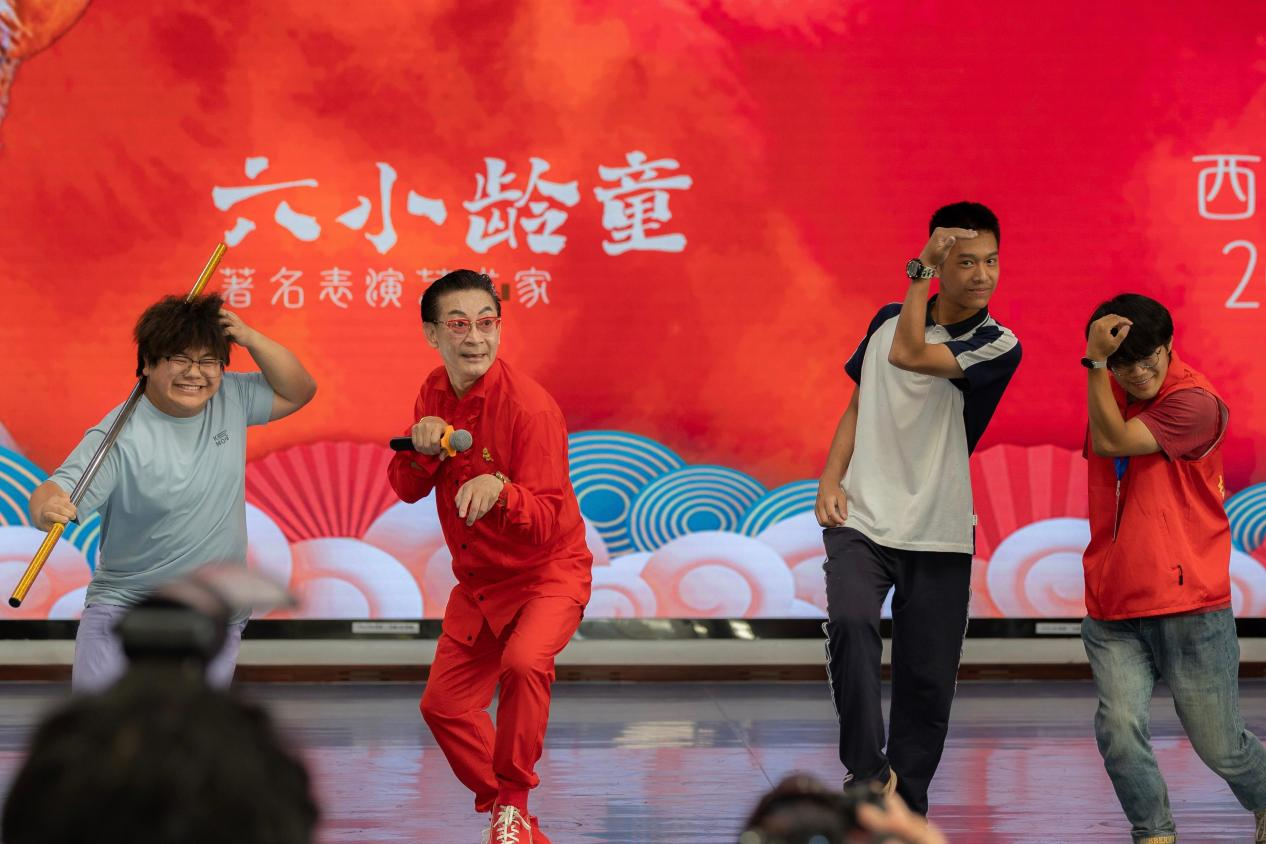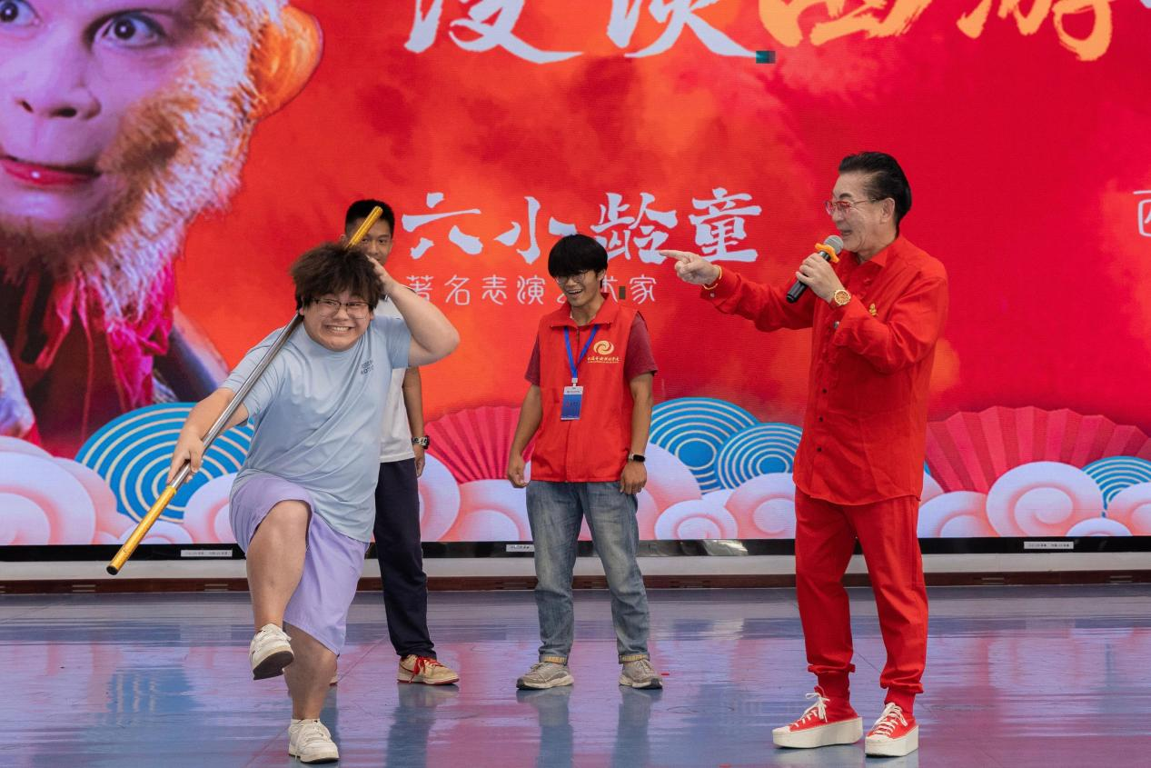 讲座进入尾声时,伴随台下热情如火的呼声,六小龄童老师挑选了三位学生上台互动。他亲自示范金箍棒技法、猴王站姿与神态,现场指导学生模仿表演,细致教授动作细节与情绪表达,生动展现猴王神韵,将经典艺术魅力传递给年轻一代。 指导结束后,六小龄童老师以一场精彩绝伦的表演将活动推向高潮。随着熟悉的配乐响起,他瞬间化身灵动的美猴王,金箍棒上下翻飞、身形腾挪辗转,或瞪眼怒喝抓耳挠腮,一招一式皆是戏。精彩的演绎让现场师生仿若置身取经之路,雷鸣般的掌声经久不息