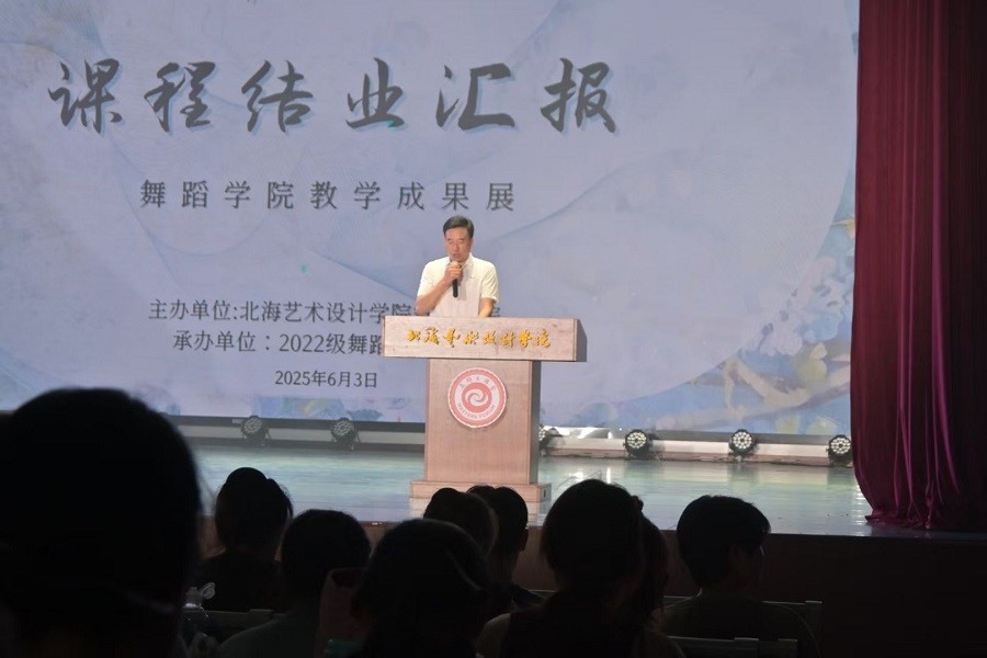 北海艺术设计学院舞蹈学院于2025年6月3日至6月4日,在学校西校区大礼堂举办舞蹈学院教学成果展暨2022级舞蹈表演专业课程结业汇报。学校党委书记覃宪儒、党委副书记陈毅华、副校长陶立阳、副校长包建明、总督学王斌、学工部部长班媚、学工部副部长刘玲花等领导嘉宾出席晚会,副校长陶立阳并为晚会致辞。