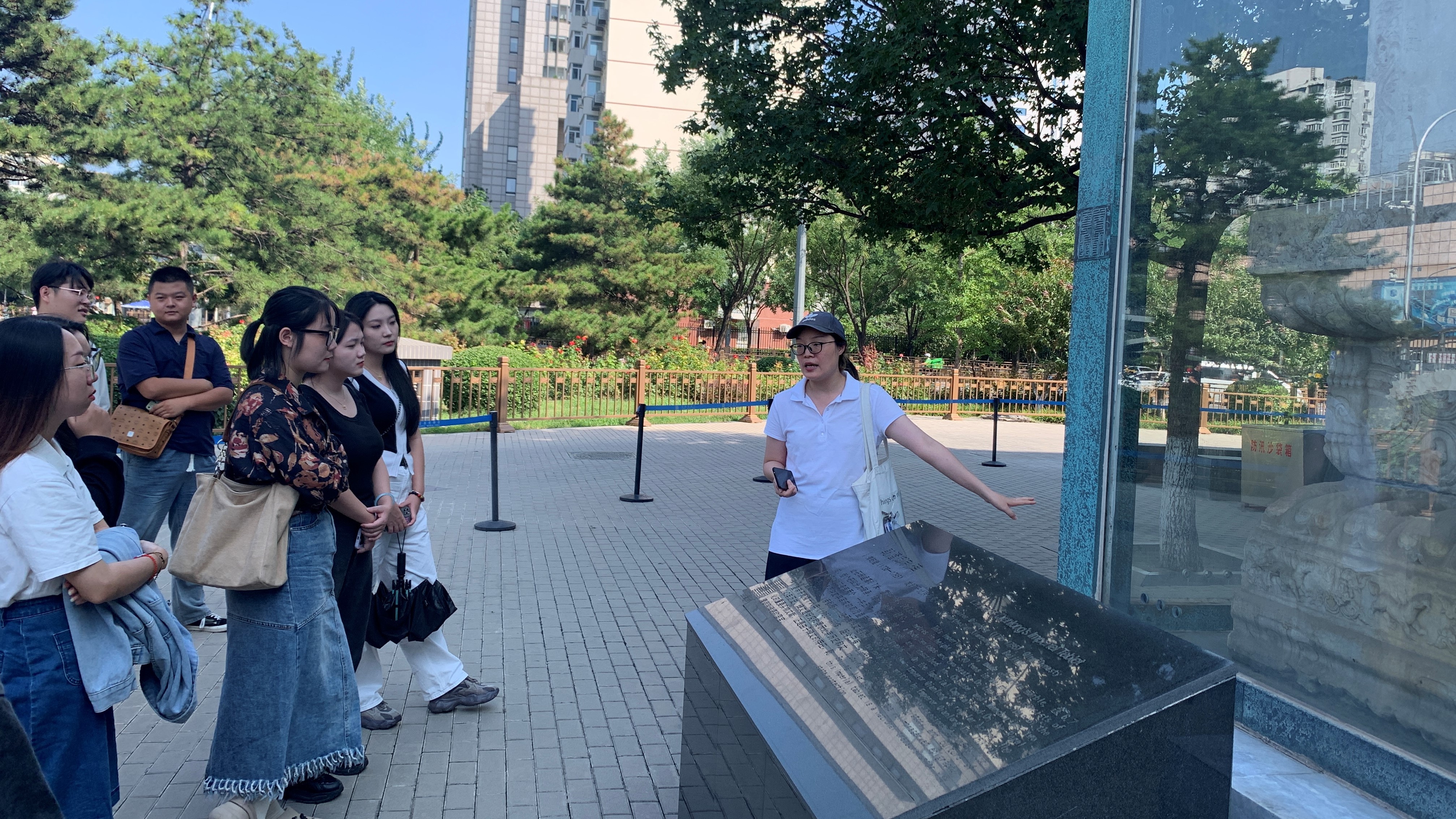 考察活动由首都博物馆展览部策展人唐宁老师全程讲解,她首先从首都博物馆最大的一件文物——伫立在馆外的乾隆御制碑展开接着,介绍了首都博物馆馆藏体积最大的文物“景德街”牌楼的历史渊源。
