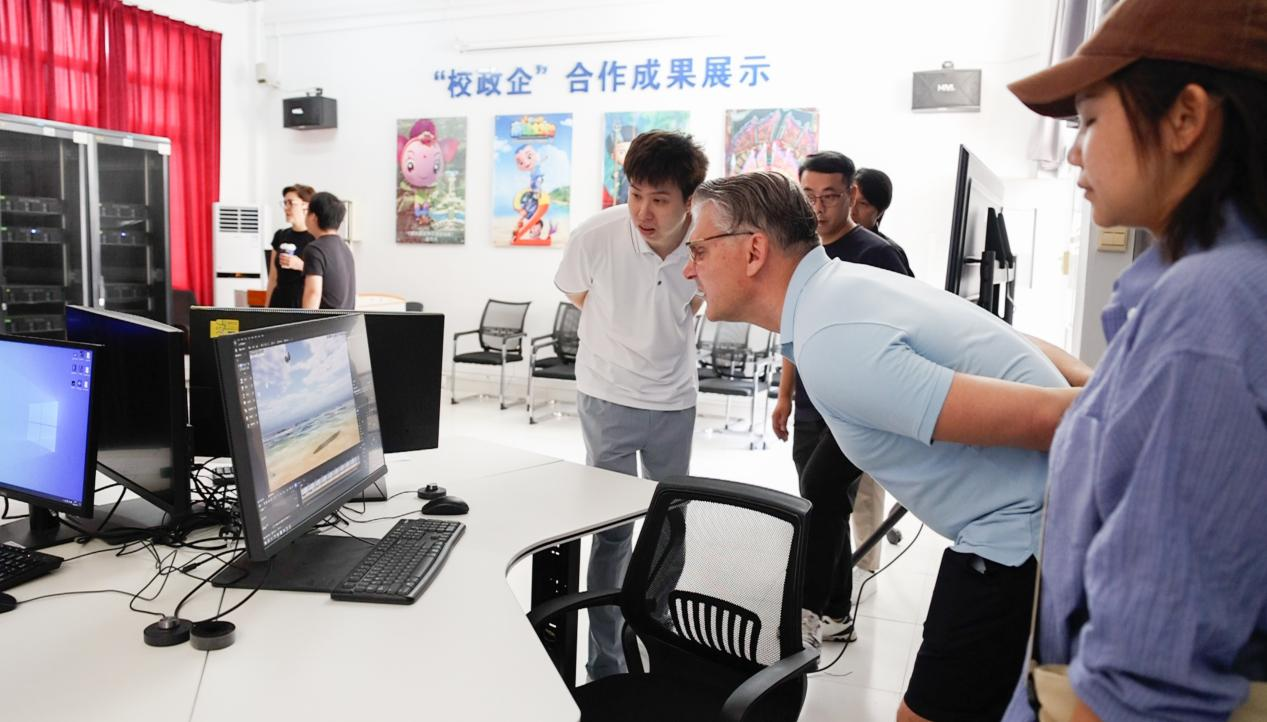 参观结束后,双方在动画与传媒学院综合楼前合影留念。Norbert教授表示,此次访问让他对我校动画与传媒学院有了更深入的了解,也让他看到了两校在动画与数字媒体教育领域合作的巨大潜力。他期待未来能够有更多的合作,促进跨文化交流。