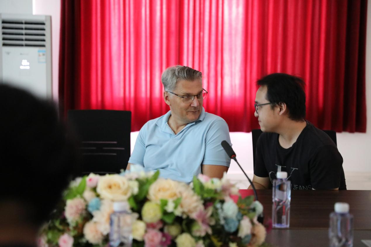 今日,匈牙利佩奇大学工业系主任、副教授、博士生导师Norbert教授,以及工程与信息技术学院建筑视觉系副教授、博士生导师Erika教授,在我校董事长郑念贻先生以及动画与传媒学院杜博副院长、李宗毅副院长等学院领导与老师的陪同下,对动画与传媒学院进行了深入的参观与交流。