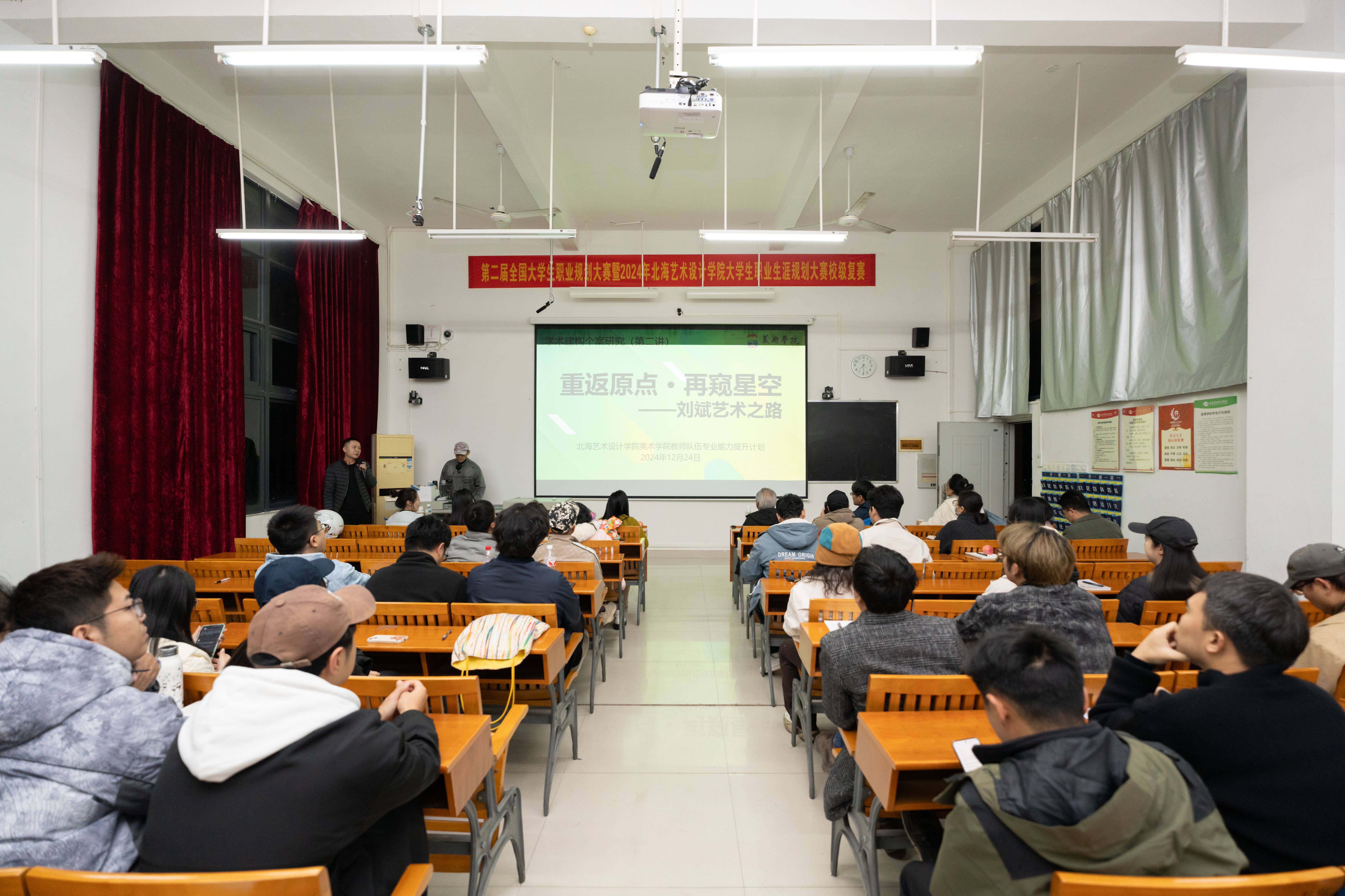 1224日晚,美术学院在伦理楼101教室成功举办了教师队伍专业能力提升计划系列课程的第二讲。本次课程以重返原点·再窥星空——刘斌艺术之路为主题,由美术学院院长、原中央美术学院壁画系教授刘斌主讲。学院办公室主任李康楠主持本次讲座,出席人员有美术学院执行院长龚为教授、副院长金凯婧、雕塑专业学科带头人王少军教授以及雕塑、绘画、美术学专业的专任教师。
