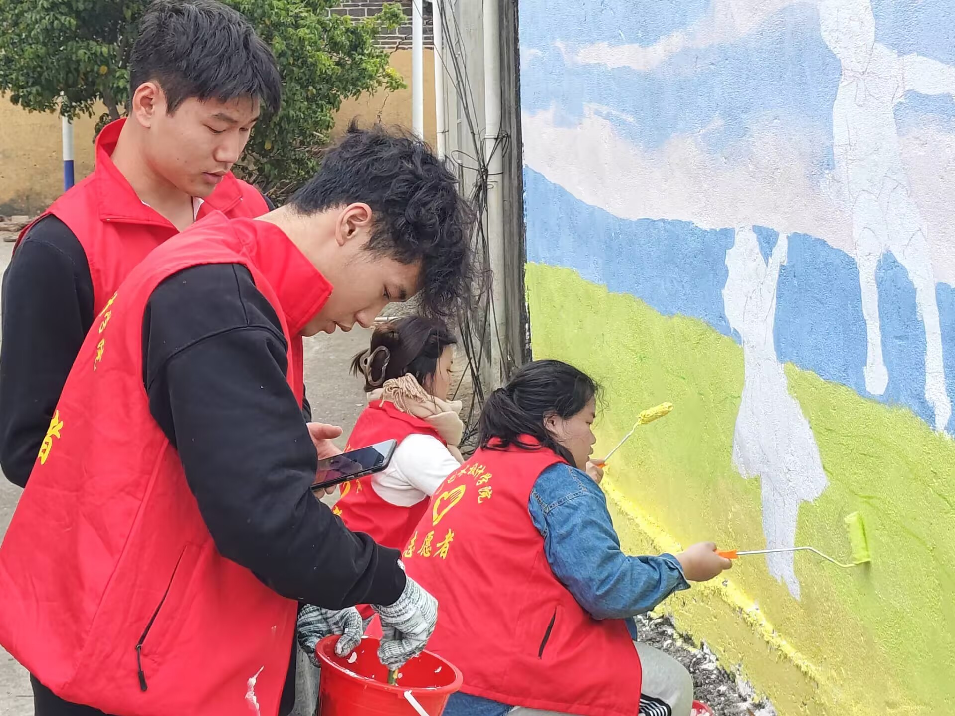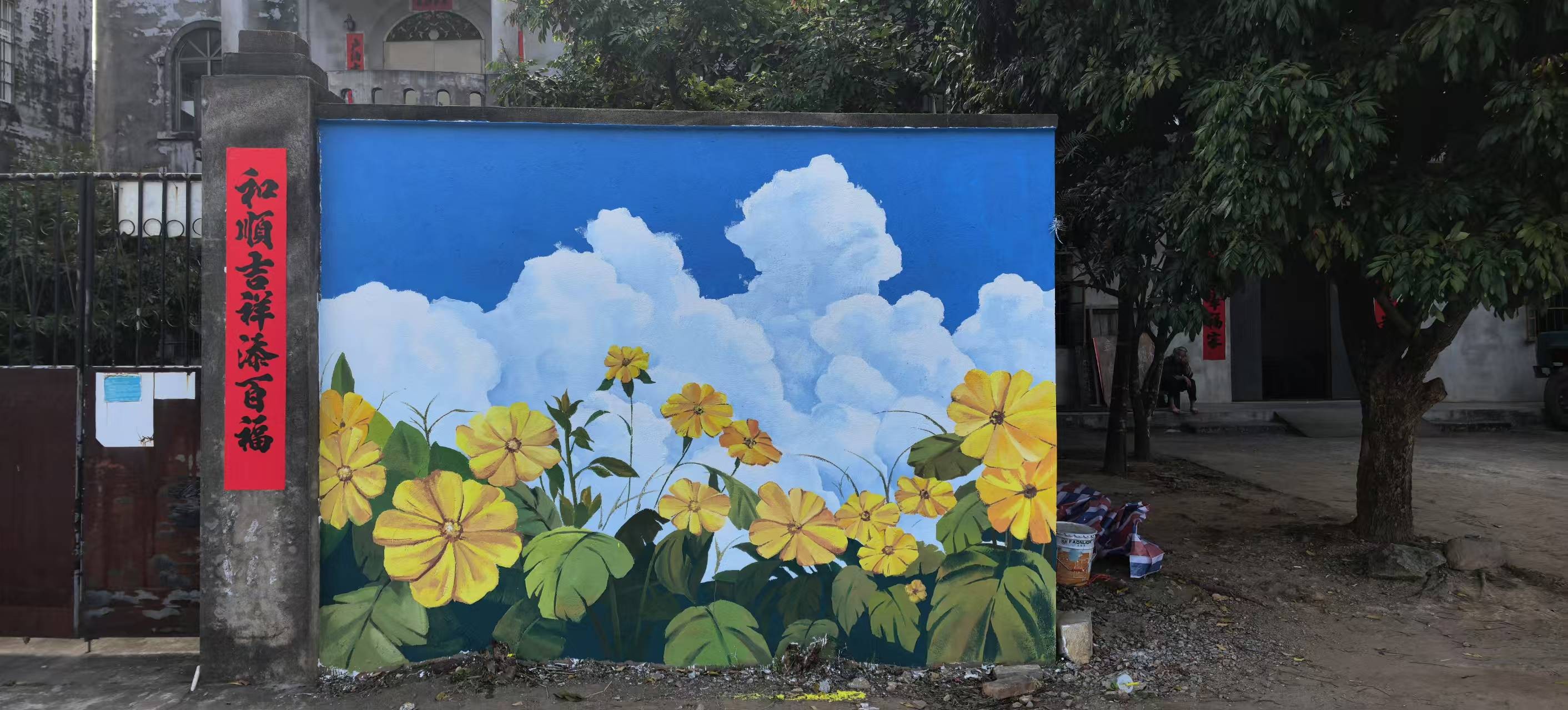 井山村“小洱海”墙绘项目以“红色文化”“农耕文明”“生态旅游”等为主题,30余名师生从调研、设计、实施总计耗时3个月,在五百平方米墙面上创作《红色文化》《渔耕四季》《柿柿如意》等系列作品,将当地特色文化、田园风光转化为可互动的视觉符号,打造“一步一景”的沉浸式乡村文旅体验,验收现场,庞丽副乡长表示:“墙绘不仅扮靓了村容村貌,更让村民在艺术熏陶中增强了文化自信。”