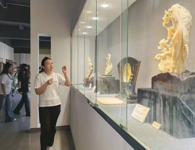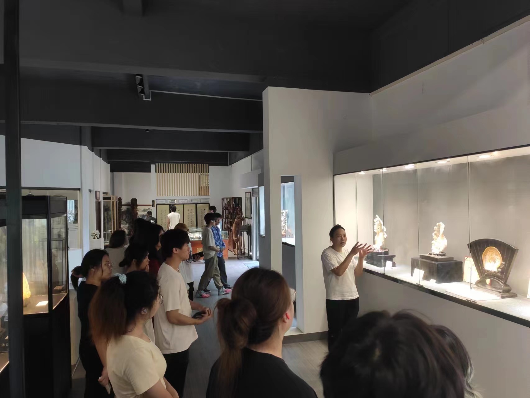 考察的第二站是龚琼辉玉雕博物馆,系统观摩广西特色玉雕南流江玉的工艺,深化传统雕刻技艺与当代艺术融合的认知,师生通过玉雕工艺流程的现场解析,学习南流江流域玉石材料的特性与雕刻技法。结合雕塑专业教学需求,重点探讨镂雕、透雕等传统技法在当代造型艺术中的转化路径,强化学生对材质语言的理解能力。
