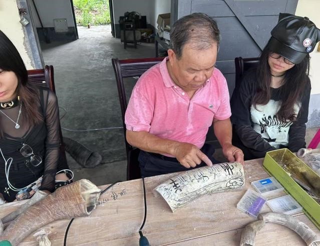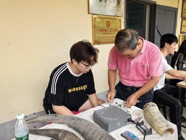 本次考查的内容着重在于传统工艺与专业融合,考察聚焦合浦角雕、南流江玉雕等广西特色工艺,结合雕塑专业特性,引导学生从材料运用、造型技法等角度分析传统工艺的现代转化可能性。活动中师生与非遗传承人白耀华大师交流、探讨传统雕刻技艺在当代艺术创作中的应用路径,以及角雕未来发展的趋势。