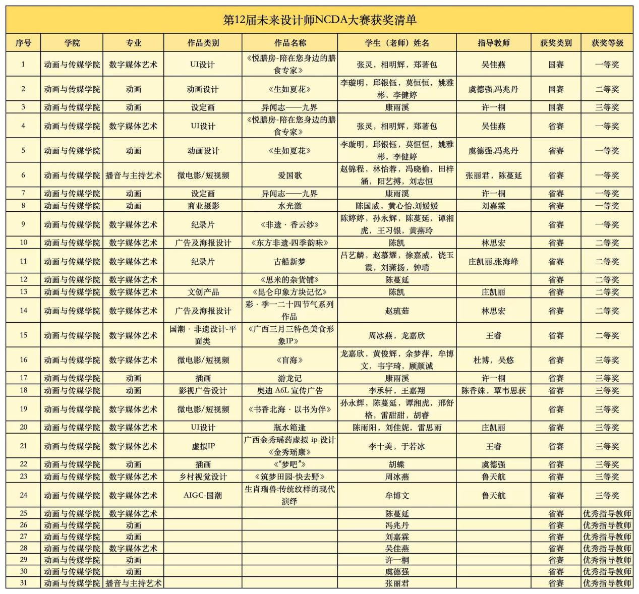 在第12届未来设计师NCDA大赛中,动画与传媒学院作品《悦膳房-陪在您身边的膳食专家》斩获国赛一等奖,作品《生如夏花》荣获国赛二等奖,作品《异闻志——九界》荣获国赛三等奖,作品《爱国歌》《非遗·香云纱》等21件作品荣获广西壮族自治区省赛奖项。动画与传媒学院陈蔓延、冯兆丹、刘嘉霖、吴佳燕、许一桐、虞德强、张丽君7位老师获评为优秀指导教师。