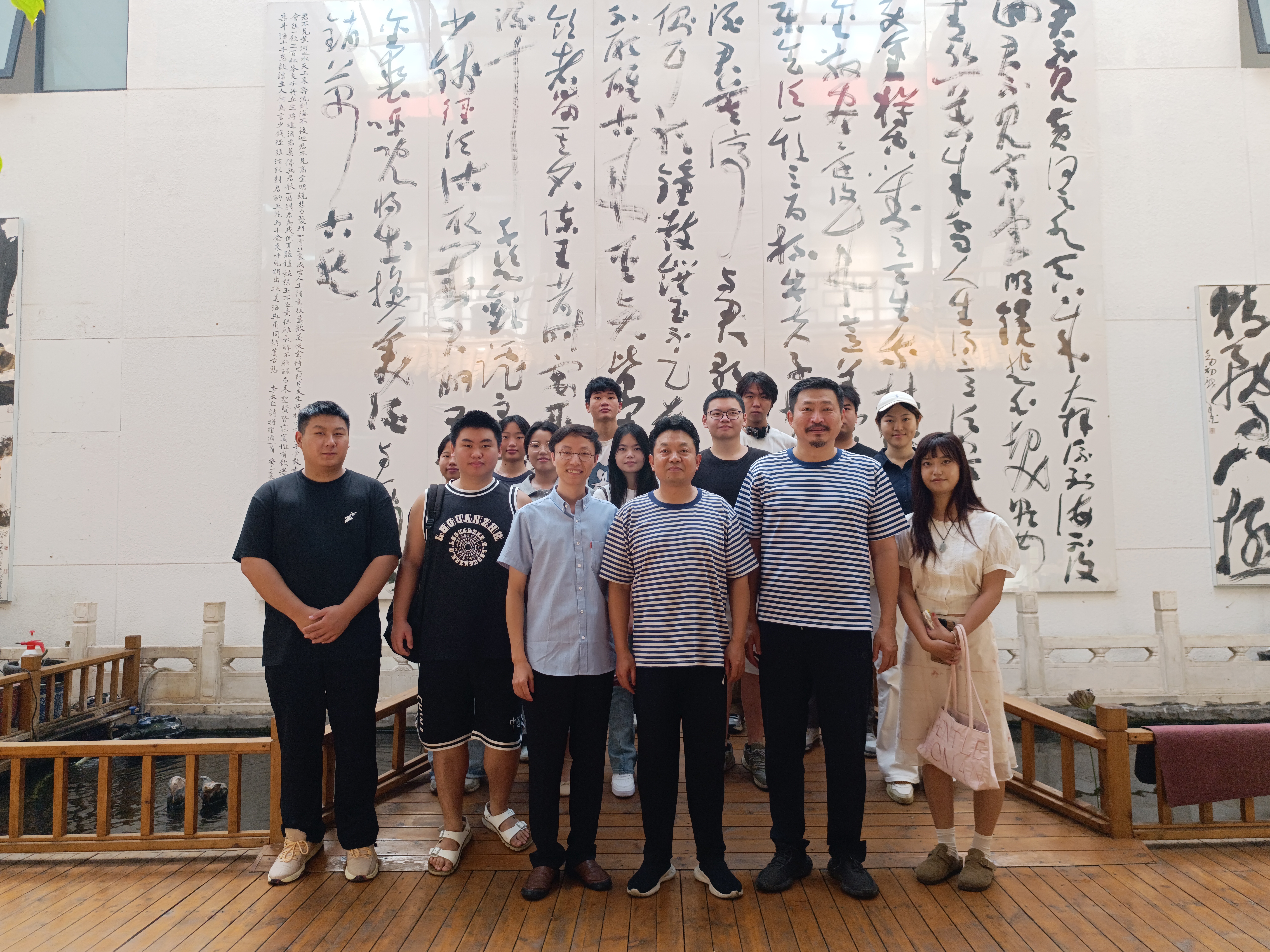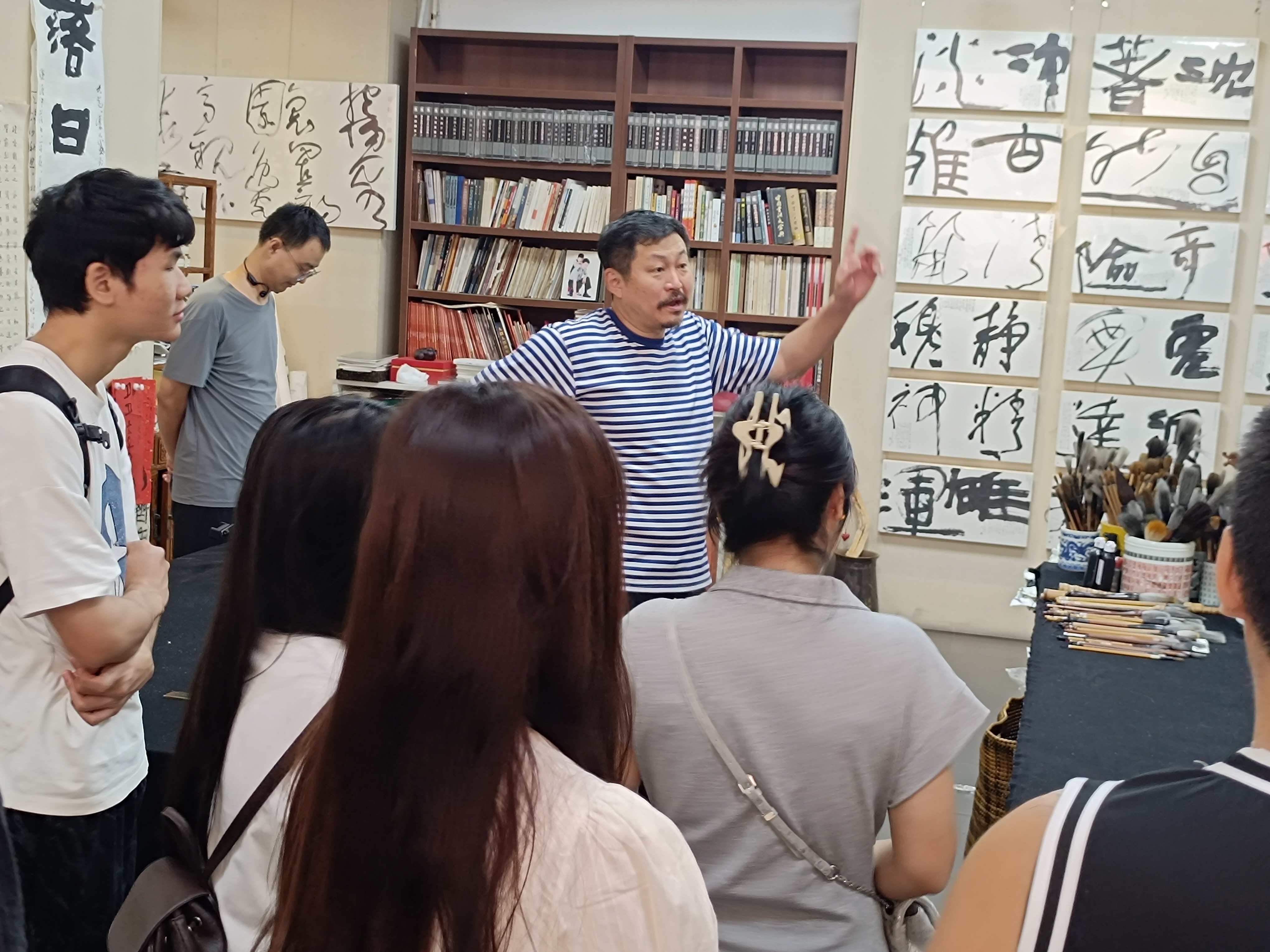 考察期间,同学们还意外邂逅了著名演员、书法家战卫华先生。因在电视剧《亮剑》中饰演“一营长”张大彪而被观众熟知的他,私下深耕书法多年,其作品以雄浑洒脱见长。战卫华与同学们围坐畅谈,分享自己从影视表演到书法创作的跨界感悟,他鼓励学生们多从生活中汲取灵感,在书法中注入个性与情感。