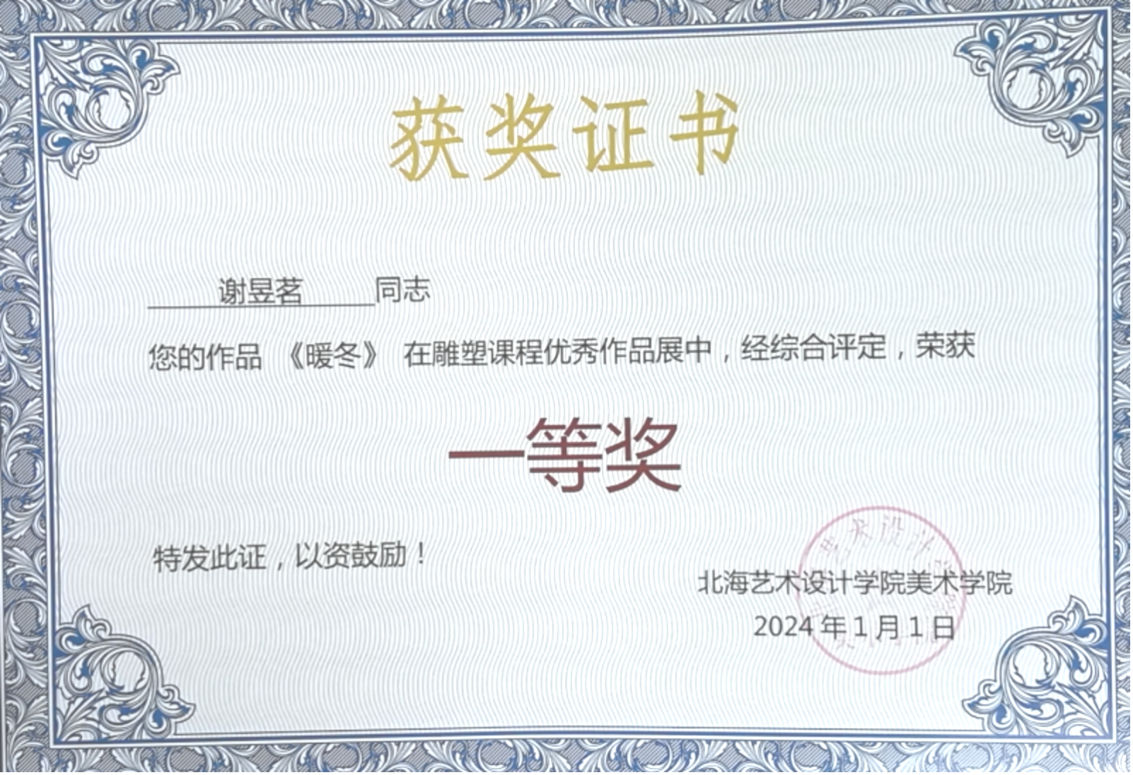 2024年1月 作品《暖冬》在雕塑课程优秀作品展中获院级一等奖;