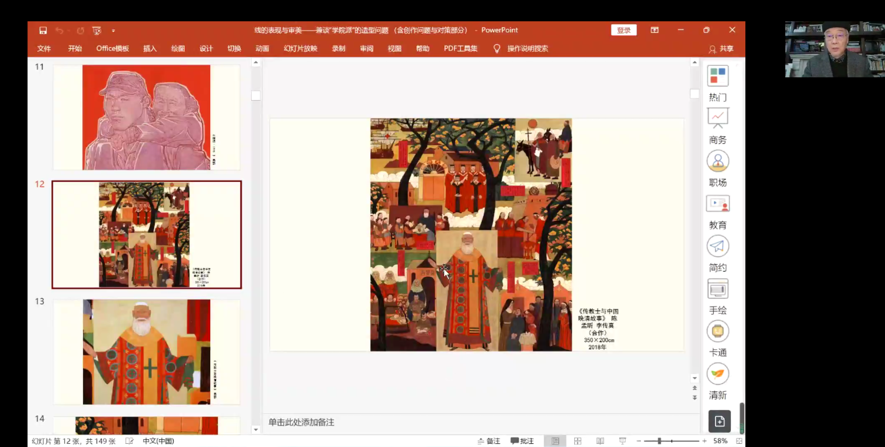20211228日上午9点,陈孟昕教授为美术学院绘画专业进行《线的表现与审美——兼谈“学院派”的造型问题》讲座,本次讲座由线上会场以及两个实体会场组成,近300名学生参与,由美术学院综合办主任肖玺主持,综合办副主任陈建江组织实体会场。