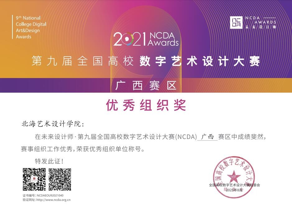 全国高校数字艺术设计大赛(未来设计师NCDA大赛)是教育部认可的国家B类赛事,由工业和信息化部人才交流中心主办,“学习强国”学习平台(开设专题展示优秀获奖作品)作为单位支持。是教育部中国高等教育学会《全国普通高校学科竞赛排行榜》内项目之一。本赛事亦属于自治区教育厅主办的B类比赛。大赛每年举办一届,已连续举办九届,参赛对象为在校师生,“学生组”及“教师组”均为中国高等教育学会发布的《全国普通高校学科竞赛排行榜》竞赛项目。2021年第九届大赛参赛学校达1456余所,近100万人次参与。