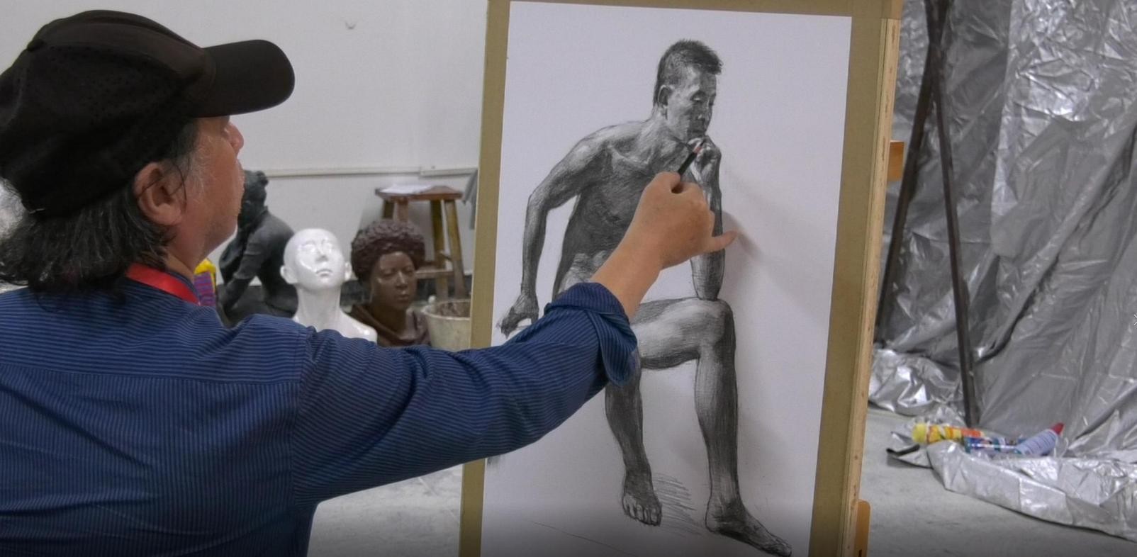 随后,曲教授开始进行示范人体写生步骤,并对创作过程进行了详细讲解。