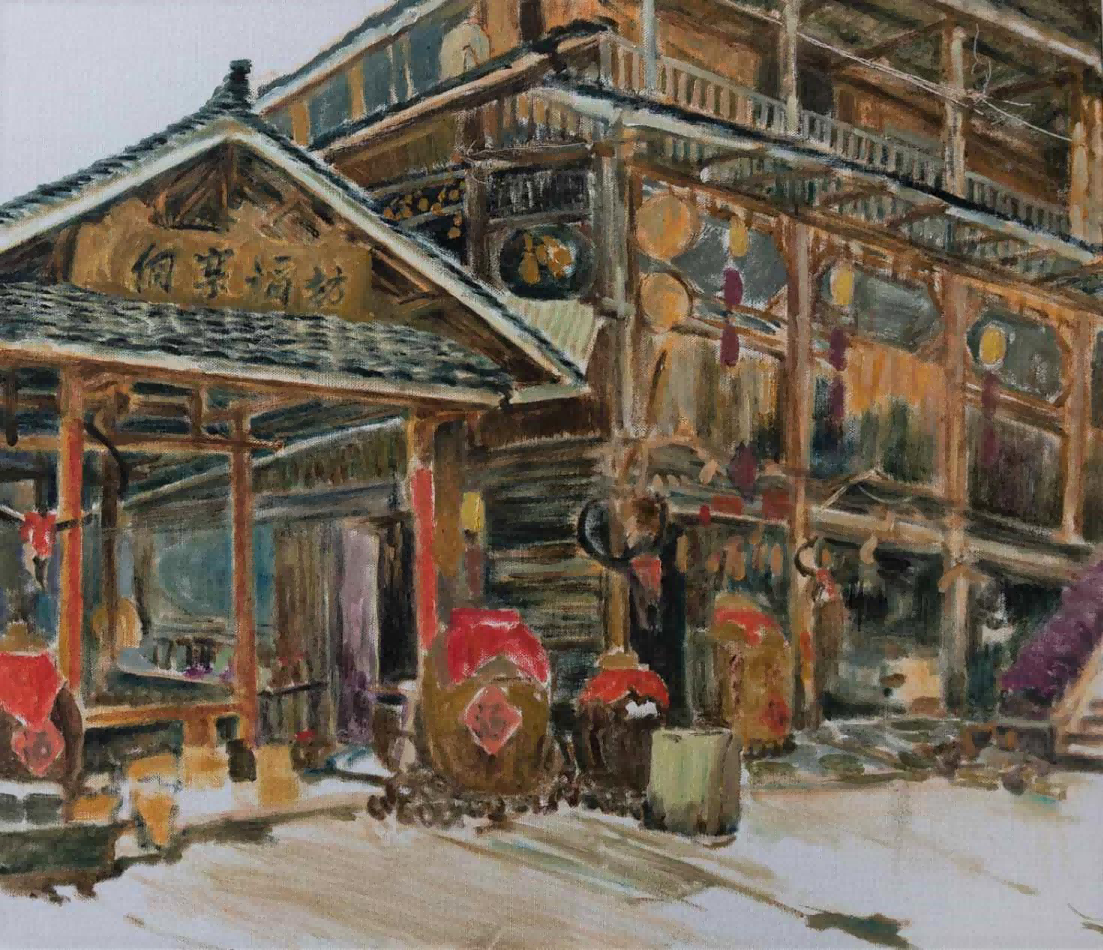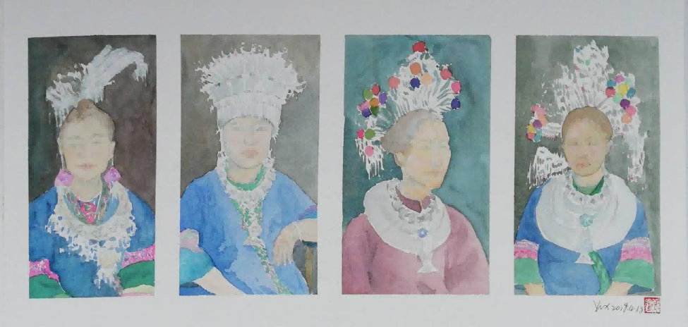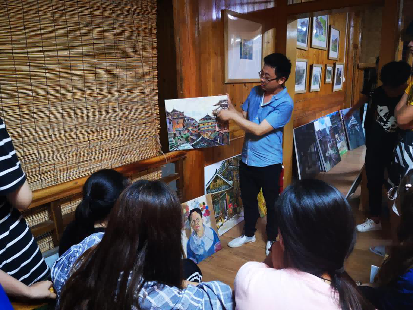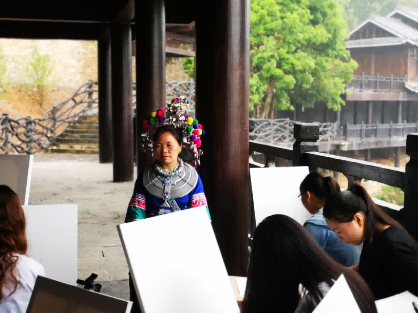 在程阳八寨写生期间,我们请来了程阳八寨本地带有浓郁民族特色的侗族村民来作为模特,进行色彩肖像写生,作为我们对于侗族人民的友好和热情表示致敬。同学们和老师们都将自己的创作才能,挥洒在这片净土之上。