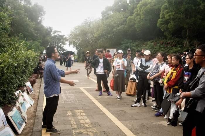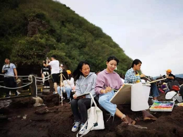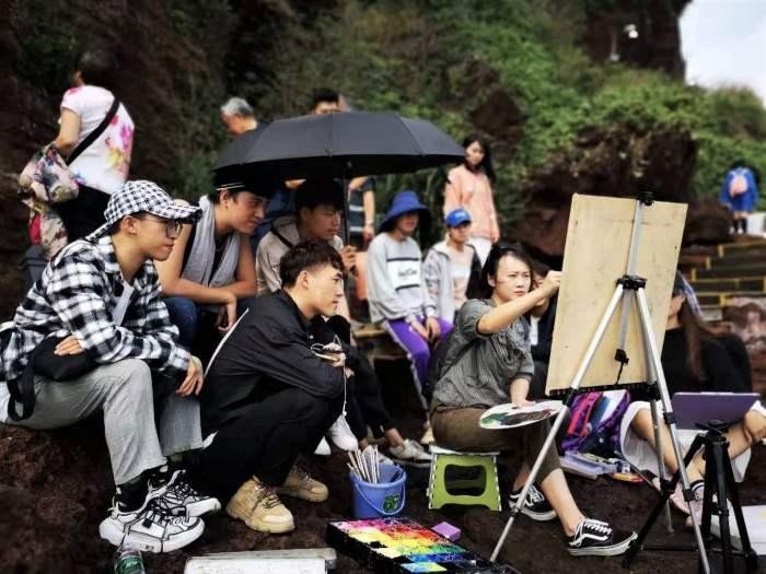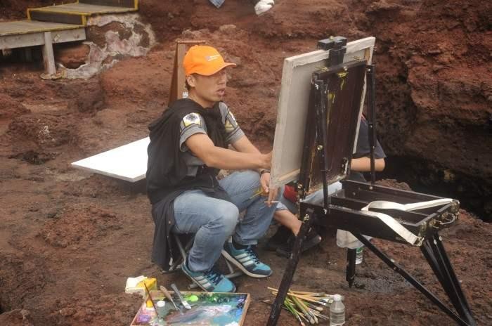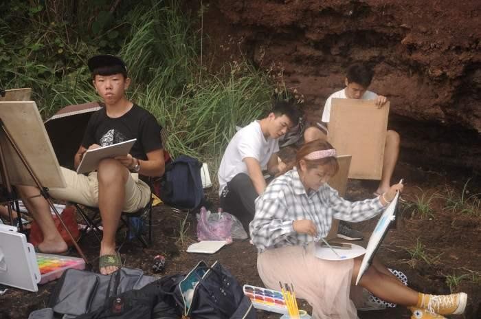 鳄鱼山公园是由火山喷发的熔岩所形成的天然景观,湛蓝的海水,赤红的火山岩礁石,再加上彰显岛屿风格的木头栈道,这一切新鲜的景象给师生们瞬间带来了无限的灵感,全体师生在大自然的鬼斧神工之下开始了对自己作品的构思并开始挥舞画笔。