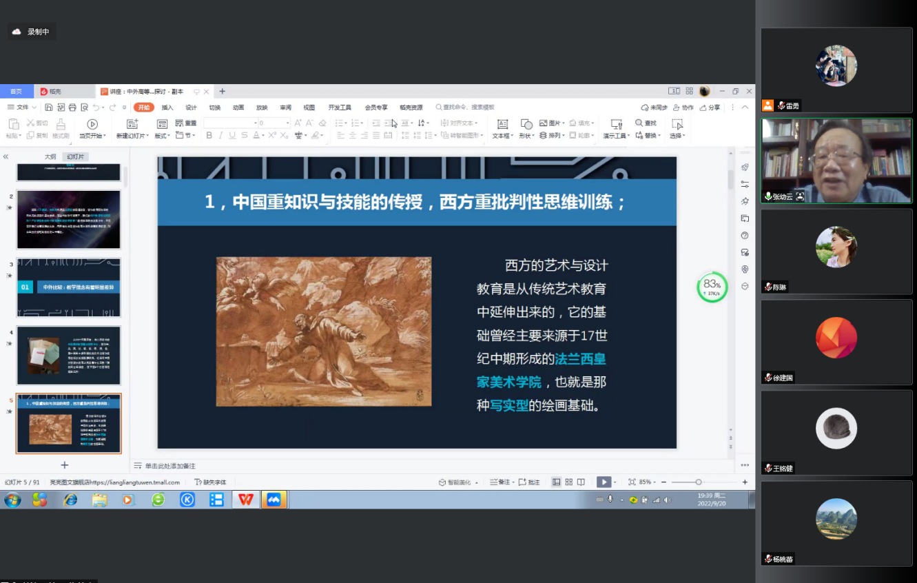 更新教育观念,坚持教育创新,提高教育质量,培养创新人才。2022年9月20日,建筑与环境艺术学院于线上开展了中外高等学校设计教育比较与产学研结合的现代设计教育模式探讨会。本次讲座邀请到的主讲人张幼云教授是北海艺术设计学院建筑与环境艺术学院教授,原广州美术学院教授、博士研究生导师、中国美术教育南方研究中心主任、国家义务教育课程标准教材和教育部学位中心评审专家。
