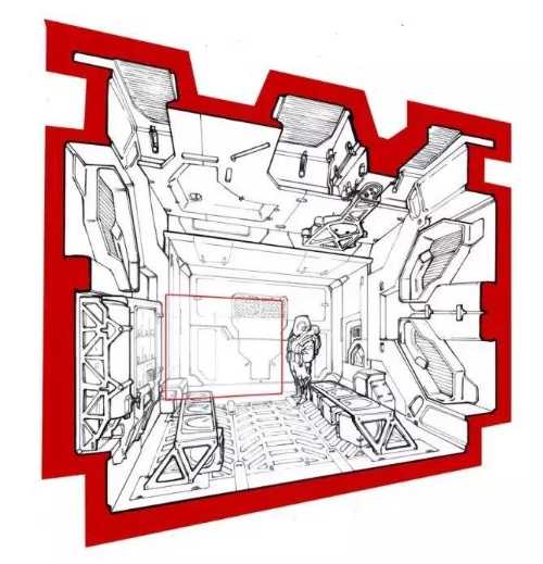 地下城电梯内景,这样一个不足20平米的小空间是整个概念设计的起点,它属于延展到地面行星发动机的一个小细节设计,是连接地下城封闭空间和地面行星发动机开放空间的纽带,是整个影片空间逻辑建立的重要枢纽。这个小设计,功能清晰,适于探索视觉风格。